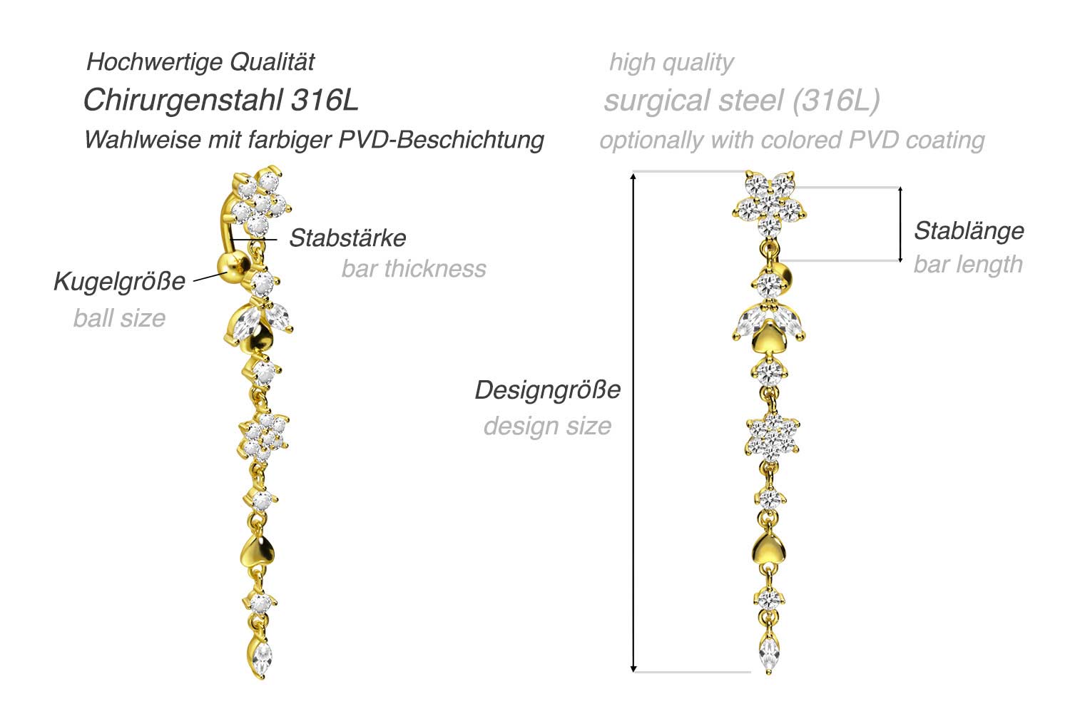 Bauchnabelpiercing hat eine Stabstärke von 1,6 mm und ist mit einer