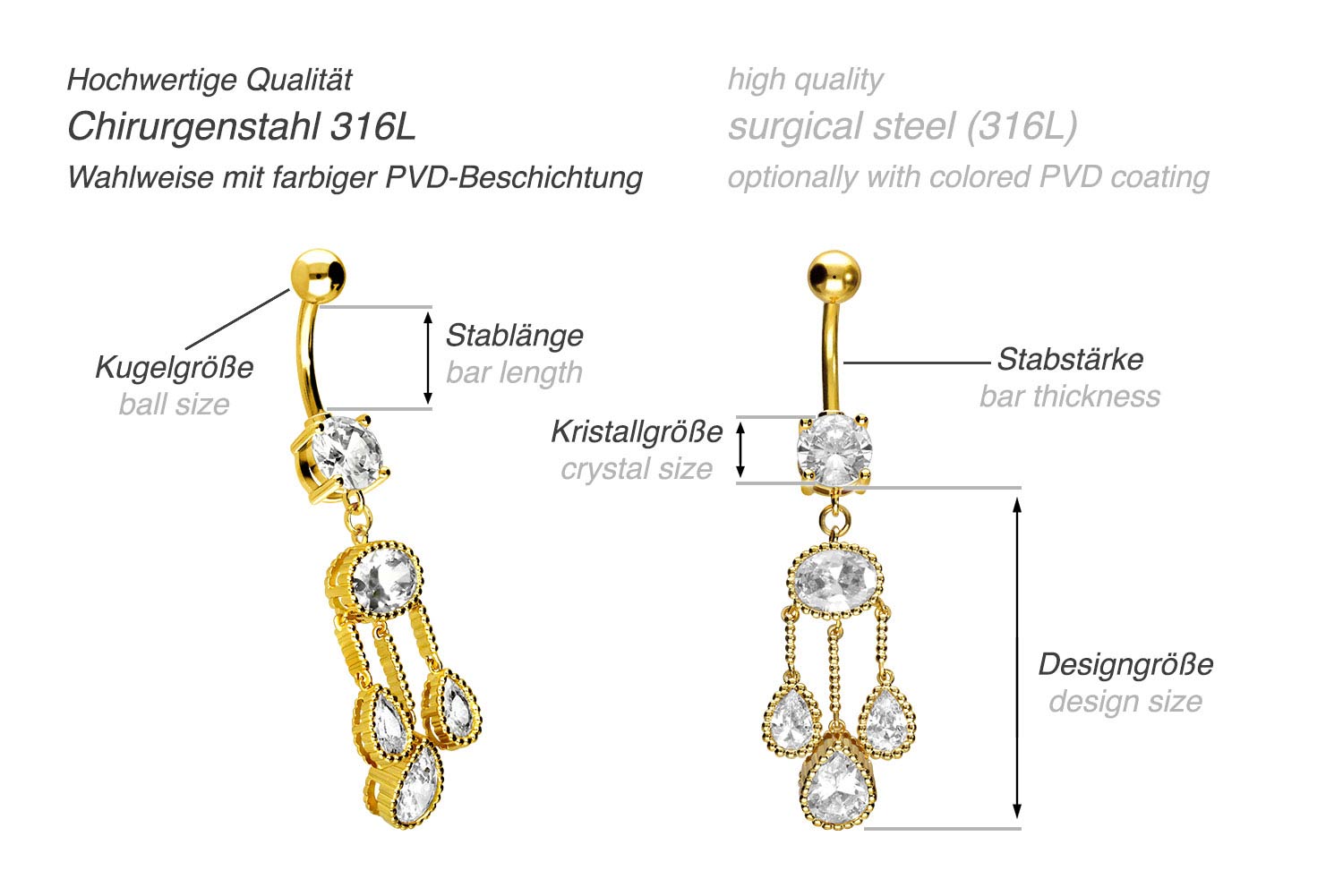 Dieses edle Bananabell ist aus hochwertigem Chirurgenstahl 316L gefertigt, der je nach gewünschter Farbe mit einer kratzfesten PVD-Beschichtung versehen ist. Zu den Materialeigenschaften von Chirurgenstahl 316L gehören neben hoher Qualität auch ebene Beschaffenheit sowie hohe Beständigkeit. Die obere Kugel kann abgeschraubt werden, während der untere Kristall mit Fassung fest mit dem Bananabell verbunden ist. Ein besonderes Highlight ist der wertvolle Anhänger: ein atemberaubend schönes orientalisches Design, das rundum mit funkelnden Kristallen besetzt ist. Sowohl die Fassung des großen Kristalls als auch der gesamte Anhänger bestehen aus Messing. Das Bauchnabelpiercing hat eine Stabstärke von 1,6 mm und ist mit einer Stablänge von 10 mm erhältlich.