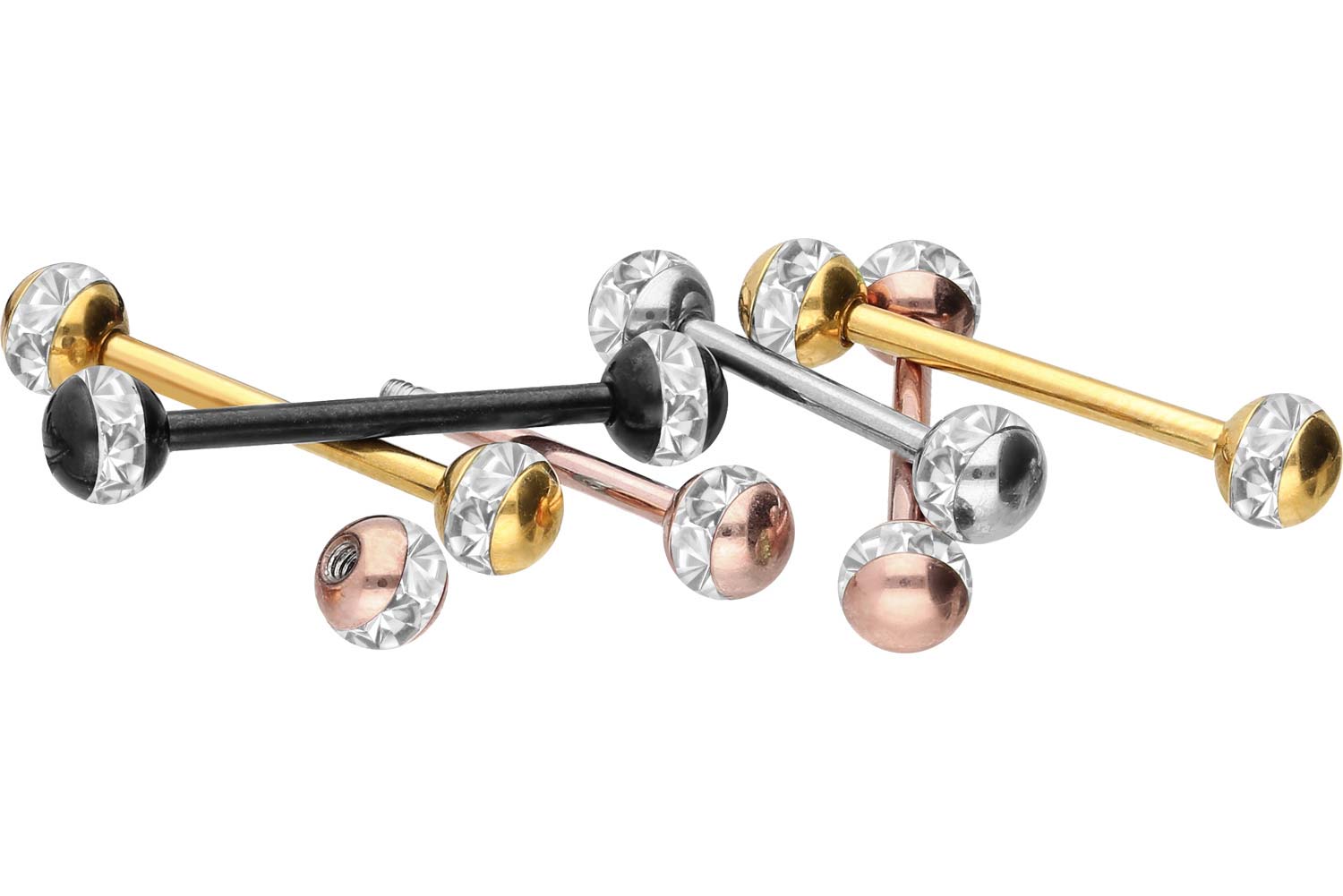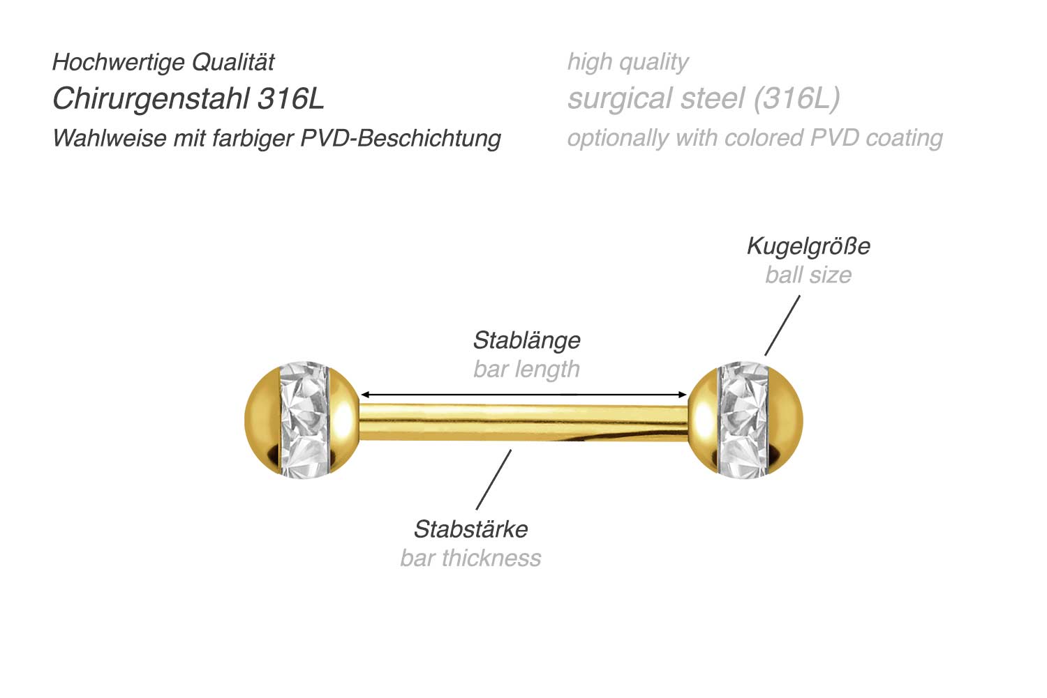 nach Wahl, die durch die Hochglanzpolitur zusätzlich veredelt wird. An den Enden des Barbells befindet sich jeweils eine angeschraubte Chirurgenstahl-Kugel. Diese beiden Kugeln sind mit je einem Ring