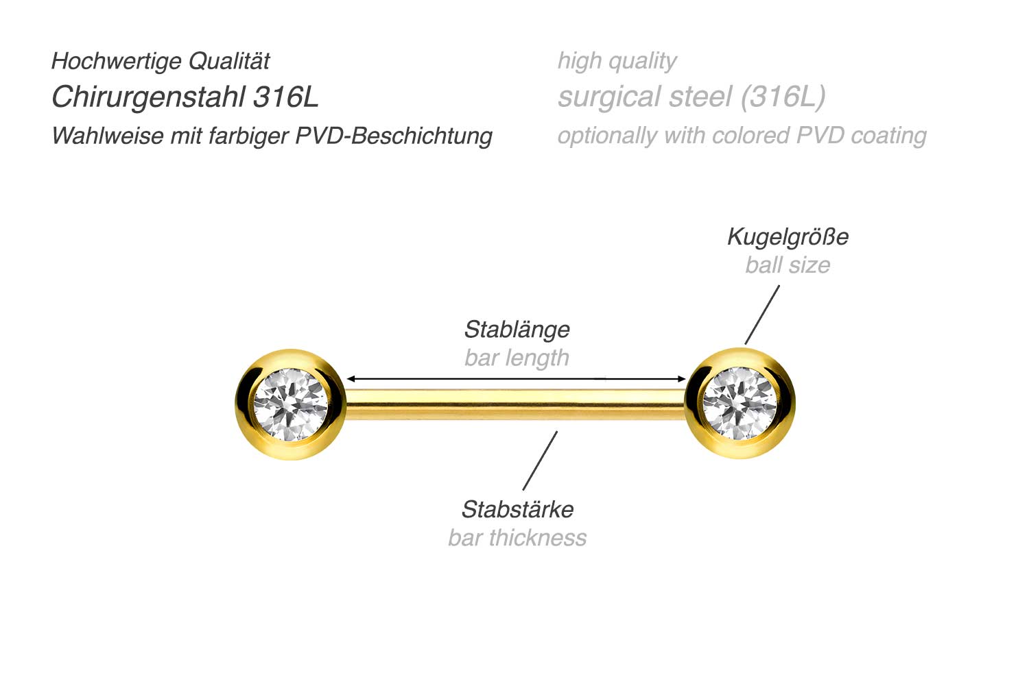 Dieses entzückende Barbell besteht aus hochwertigem Chirurgenstahl 316L, zu dessen nützlichen Materialeigenschaften sowohl hohe Beständigkeit als auch ebene Beschaffenheit gehören. Hinzu kommt Farbechtheit, die auch bei den Varianten mit PVD-Beschichtung gewährleistet wird. Aufgrund der seitlich an den Schraubkugeln angebrachten Kristalle eignet sich dieses Schmuckstück beispielsweise hervorragend zur Verwendung als Nippelpiercing. Es verfügt über eine Stabstärke von 1,6 mm und ist mit den unten aufgeführten Stablängen erhältlich.