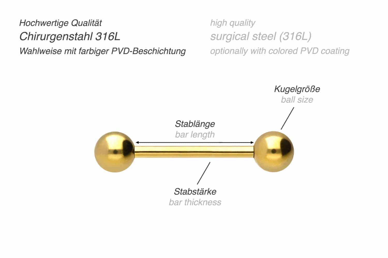 Dieses klassische Barbell ist aus hochwertigem Chirurgenstahl 316L gefertigt, der je nach Farbwunsch mit einer kratzfesten PVD-Beschichtung versehen ist. Zu den Materialeigenschaften von Chirurgenstahl gehören neben der hohen Qualität auch ebene Beschaffenheit und hohe Beständigkeit. Darüber hinaus werden viele Kombinationsmöglichkeiten mit unserem Schraubzubehör gewährleistet, da beide Kugeln abgeschraubt werden können. Dank seines 1,2 mm starken Gewindes gilt das auch für das Barbell mit 1 mm Stabstärke. All seine verfügbaren Stabstärken und -längen sind unten aufgeführt.