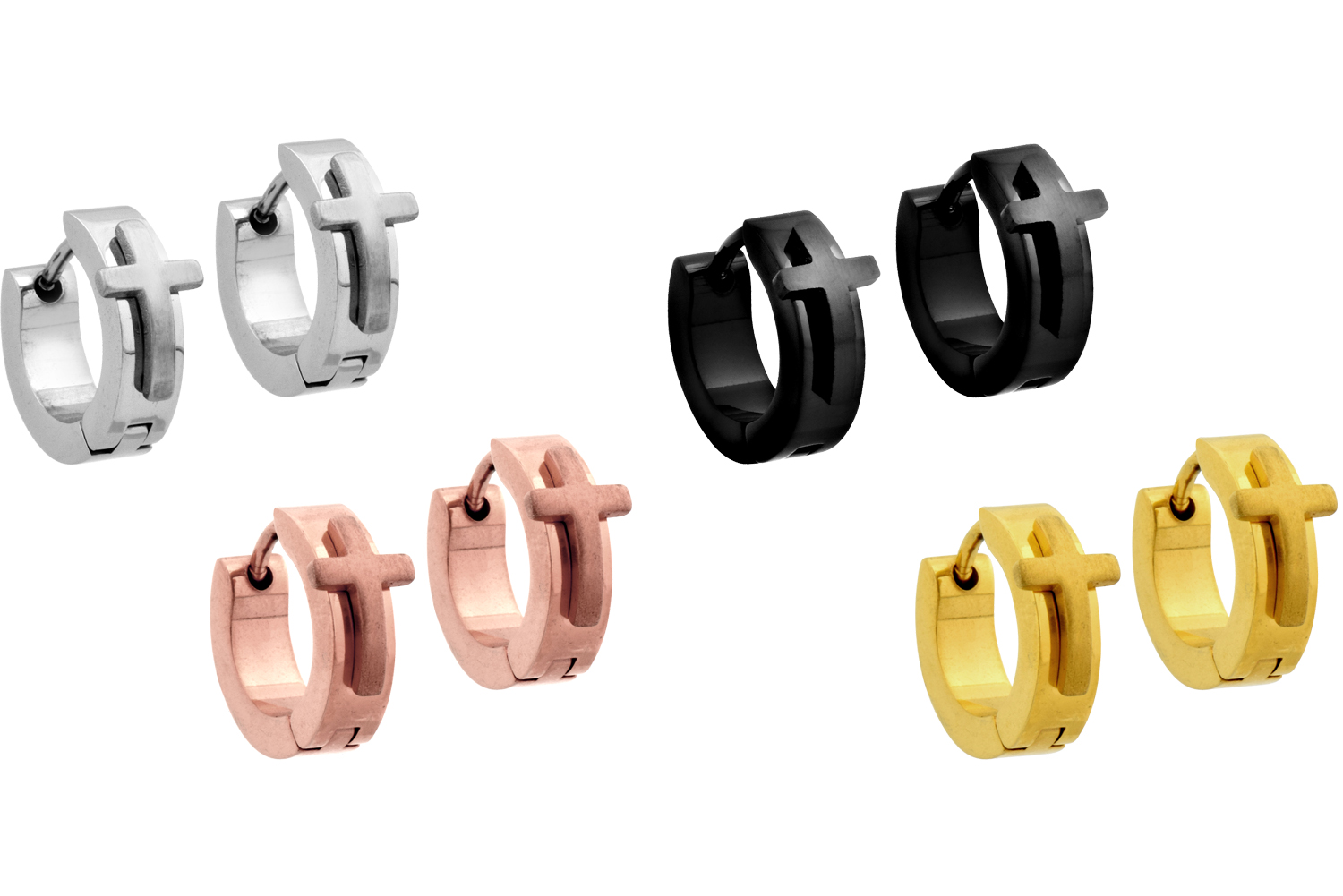 Diese klassischen Ohrringe aus unserer Filango Collection bestehen aus hochqualitativem Chirurgenstahl und überzeugen durch die hochwertige Verarbeitung. Durch die verschiedenfarbigen Beschichtungen und die zusätzlich aufgebrachten Kreuze wird der Ohrring zu einem eleganten Schmuckstück. Das verwendete Material zeichnet sich durch seine hohe Kratz- und Korrosionsbeständigkeit aus – kein Anlaufen, kein Rosten. Die Oberfläche ist mit einer Hochglanzpolierung veredelt, durch die die Klappcreolen ein edles Finish erhalten, welches keiner besonderen Schmuckpflege bedarf.
