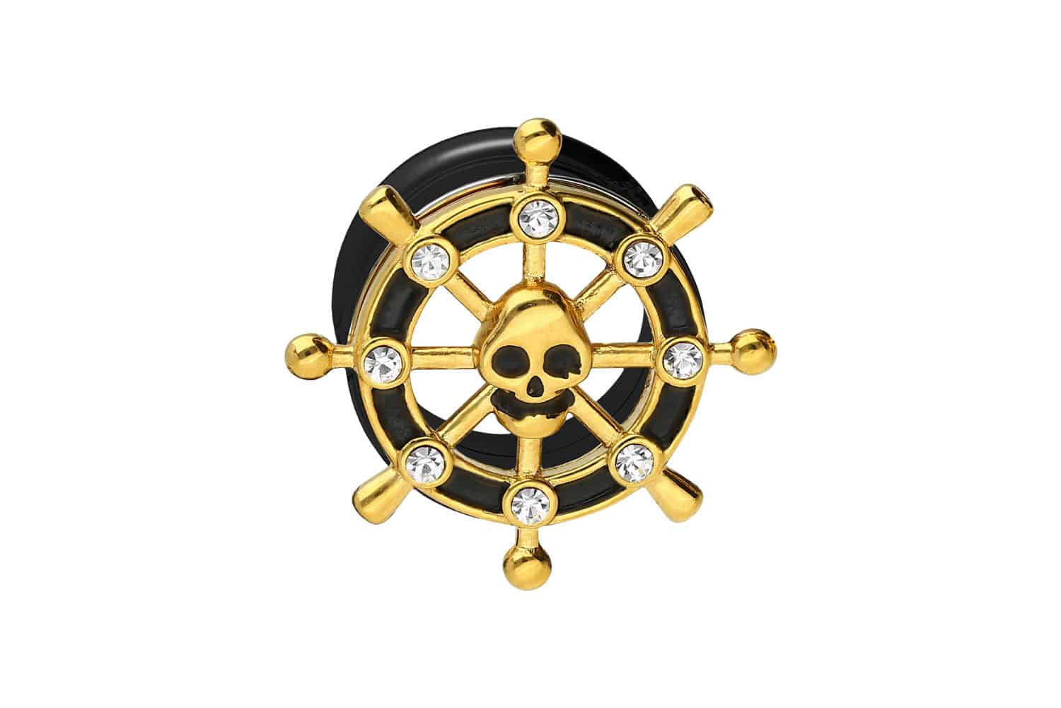 Dieser schicke Tunnel ist aus hochwertigem Chirurgenstahl 316L gefertigt. Sein unverwechselbares Design mit einem goldfarbenen Steuerrad, einem Totenkopf und kleinen klaren Kristallen macht ihn zu einem schönen und zeitlosen Hingucker. Dank des Materials ist der Tunnel beständig und langlebig, bei einer guten Hautverträglichkeit. Das Innengewinde sorgt für eine spielend leichte Handhabung. Dieser Tunnel ist mit einem Außendurchmesser von 8 / 10 / 12 / 14 oder 16 mm erhältlich und wahlweise mit einer schwarzen PVD-Beschichtung versehen.