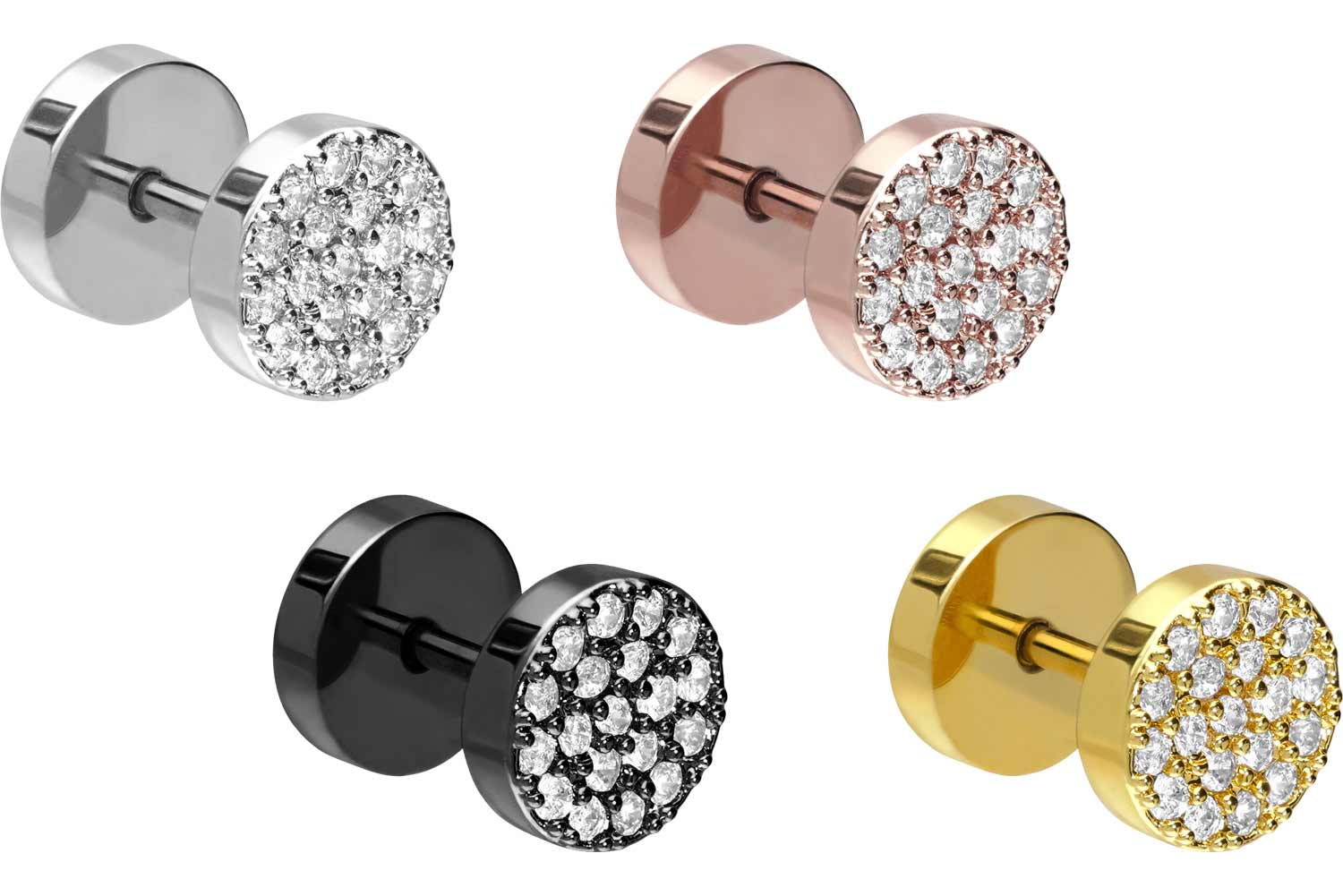 Dieser funkelnde Fake Plug besteht hauptsächlich aus hochwertigem Chirurgenstahl 316L, zu dessen spezifischen Materialeigenschaften unter anderem hohe Beständigkeit und ebene Beschaffenheit gehören. Wohingegen die vordere mit zahlreichen Kristallen besetzte Disc aus Messing gefertigt wurde. Falls gewünscht, sorgt zudem eine kratzfeste PVD-Beschichtung für eine kräftige Farbe nach Wahl. Dieses Schmuckstück verfügt stets über eine Stabstärke von 1,2 mm sowie eine Stablänge von 6 mm und ist mit einer Discgröße von 8 mm erhältlich.