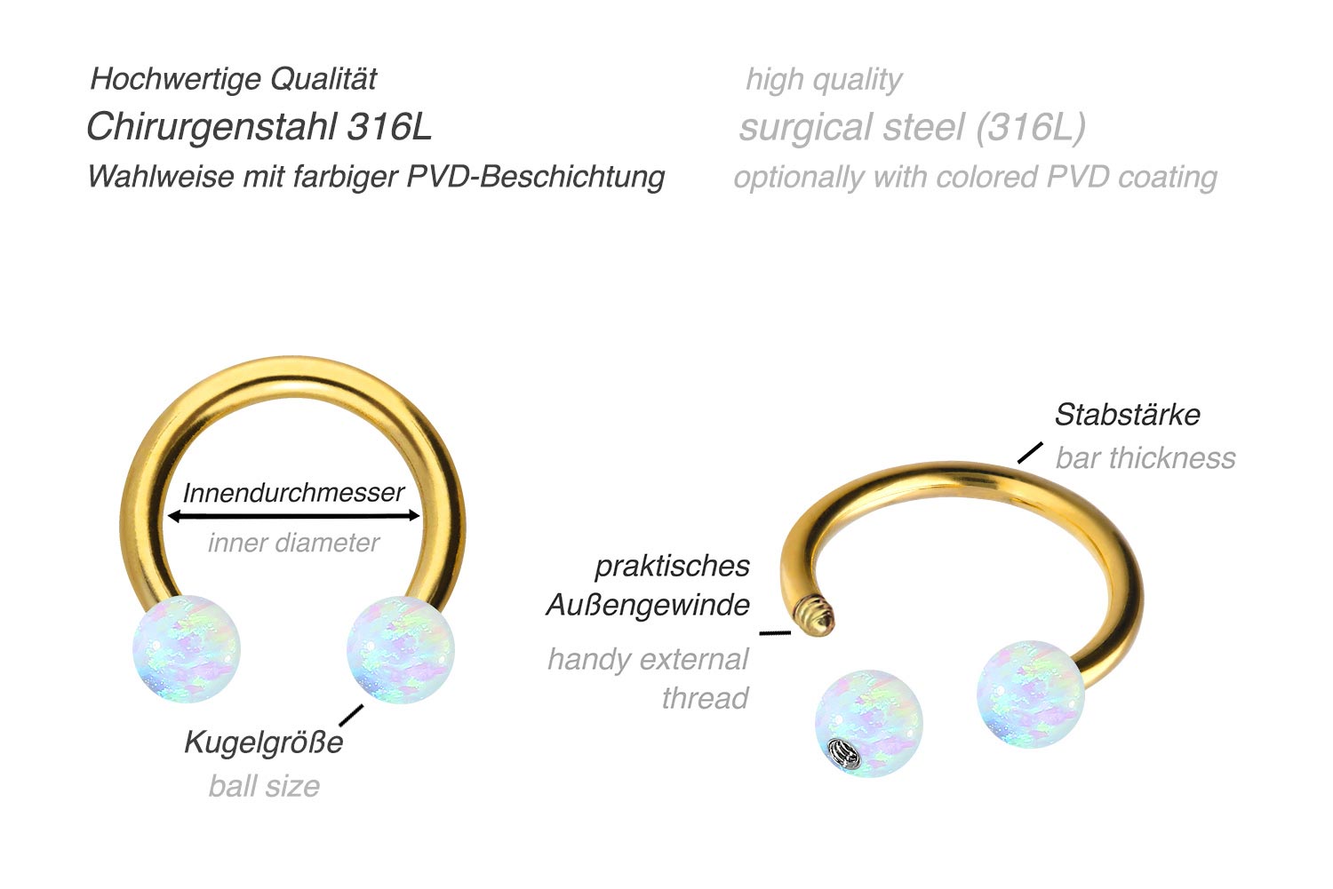 Dieser stilvolle Hufeisenring besteht aus hochwertigem Chirurgenstahl 316L, der unter anderem für spezifische Eigenschaften wie etwa hohe Beständigkeit und ebene Beschaffenheit bekannt ist. Falls gewünscht, sorgt eine kratzfeste PVD-Beschichtung für eine kräftige Farbe nach Wahl. An beiden Enden des Hufeisenrings befindet sich ein angeschraubter synthetischer Opal. Der Synthetisierungsprozess dieser wunderschön schimmernden Opale nimmt mehrere Monate in Anspruch und wird per Hand durchgeführt. Auch das ist ein Umstand, der zu ihrem einzigartigen Charme beiträgt. Das Schmuckstück verfügt über eine Stabstärke von 1,2 mm und ist in den unten aufgeführten Innendurchmessern erhältlich.