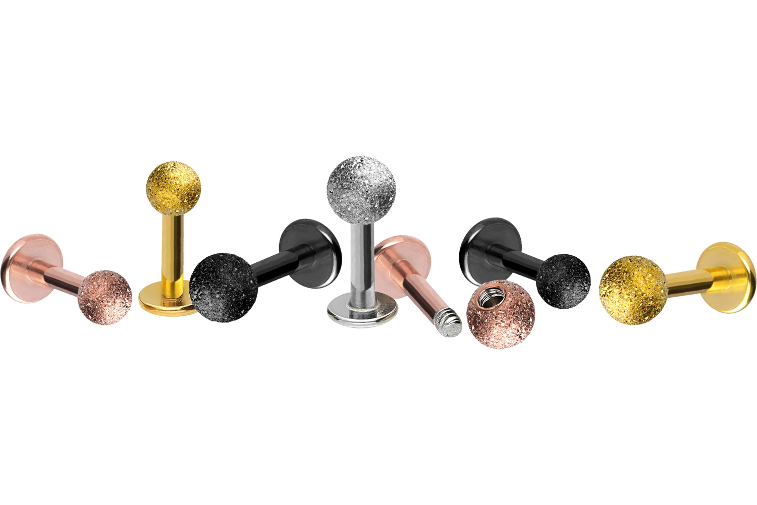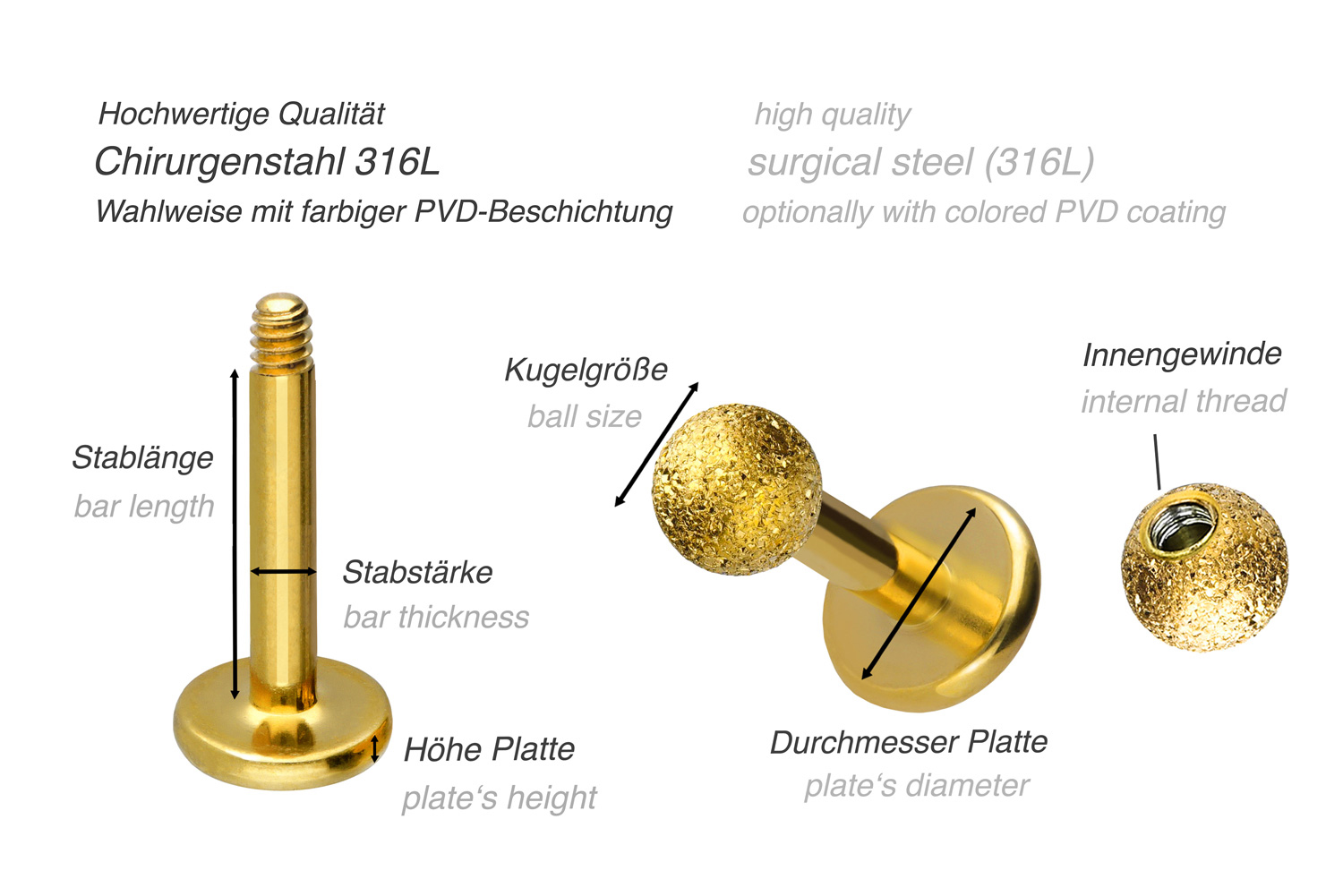 Farbe nach Wahl, die durch die Hochglanzpolitur zusätzlich veredelt wird. Am vorderen Ende des Labrets befindet sich eine Kugel, die abgeschraubt werden kann und mit der Optik eines Diamanten versehen ist. Erhältlich ist das Schmuckstück mit einer Stabstärke von entweder 1,2 oder 1,6 mm in den unten