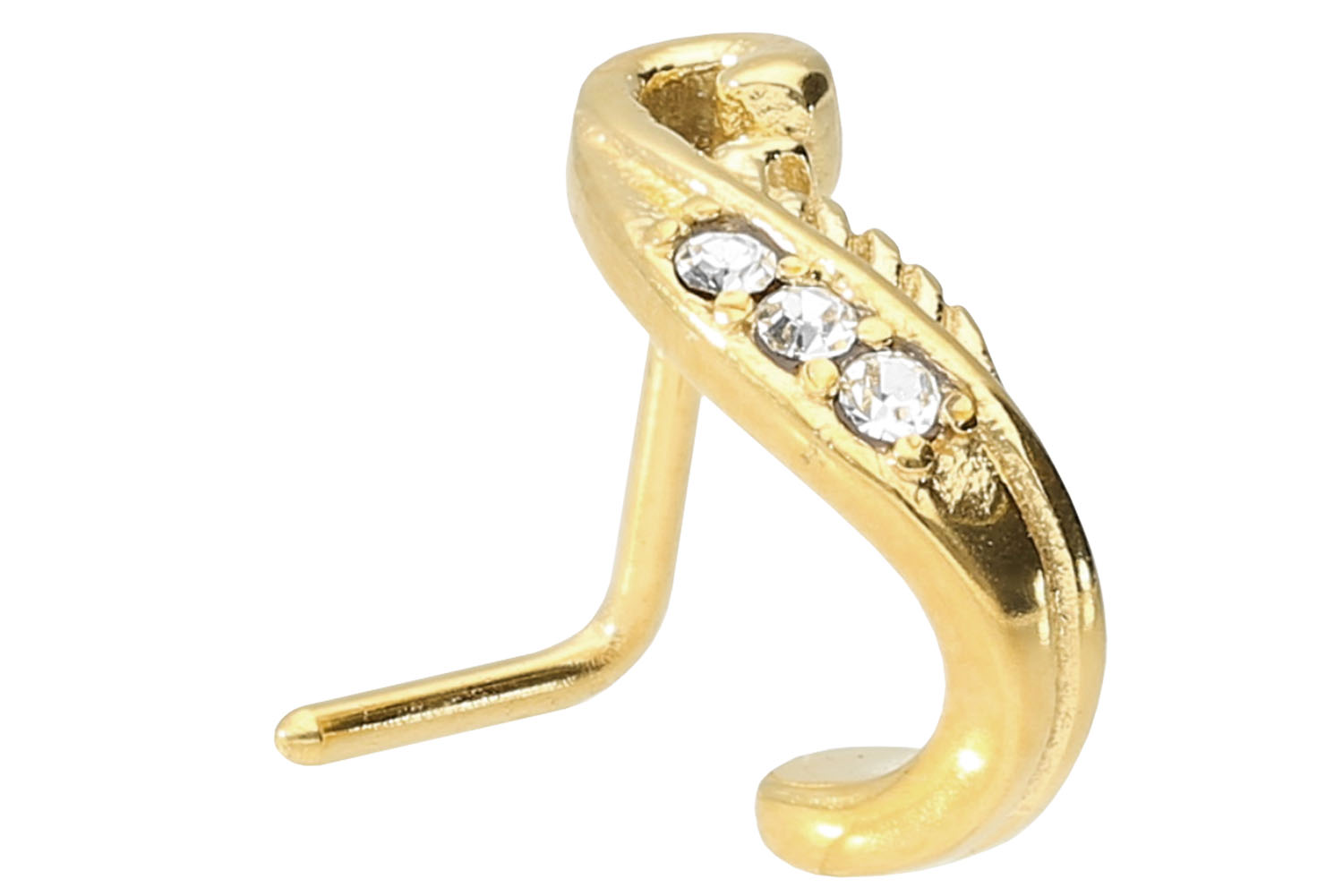 Dieses Schmuckstück vereint einen üblichen Nasenstecker mit einem Nasenring! Es ist aus hochwertigem Chirurgenstahl 316L gefertigt. Dank des L-förmigen Stabes ist ein guter Halt in der Nase gewährleistet und das Design, welches sich außerhalb der Nase befindet, erinnert durch seine Form an einen geschlossenen Nasenring. Das Design besticht durch seine schlichte Eleganz, die durch das kristallbesetzte Blatt zusätzlich hervorgehoben wird. Das verwendete Material zeichnet sich durch seine besonderen Eigenschaften wie Farbechtheit und Materialbeständigkeit aus. Dieses Piercing ist wahlweise mit einer farbigen PVD-Beschichtung versehen.