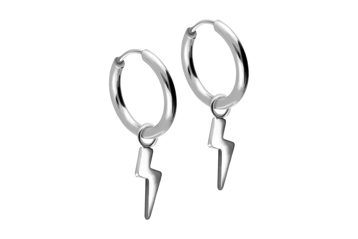 Farbe nach Wahl, die durch die Hochglanzpolitur zusätzlich veredelt wird. Als optisches Highlight ist jeweils ein Anhänger in Form eines Blitzes an jeder Creole angebracht. Sie verfügen stets über eine Stabstärke von 0,8 mm, wohingegen ihre Designstärke je nach persönlicher