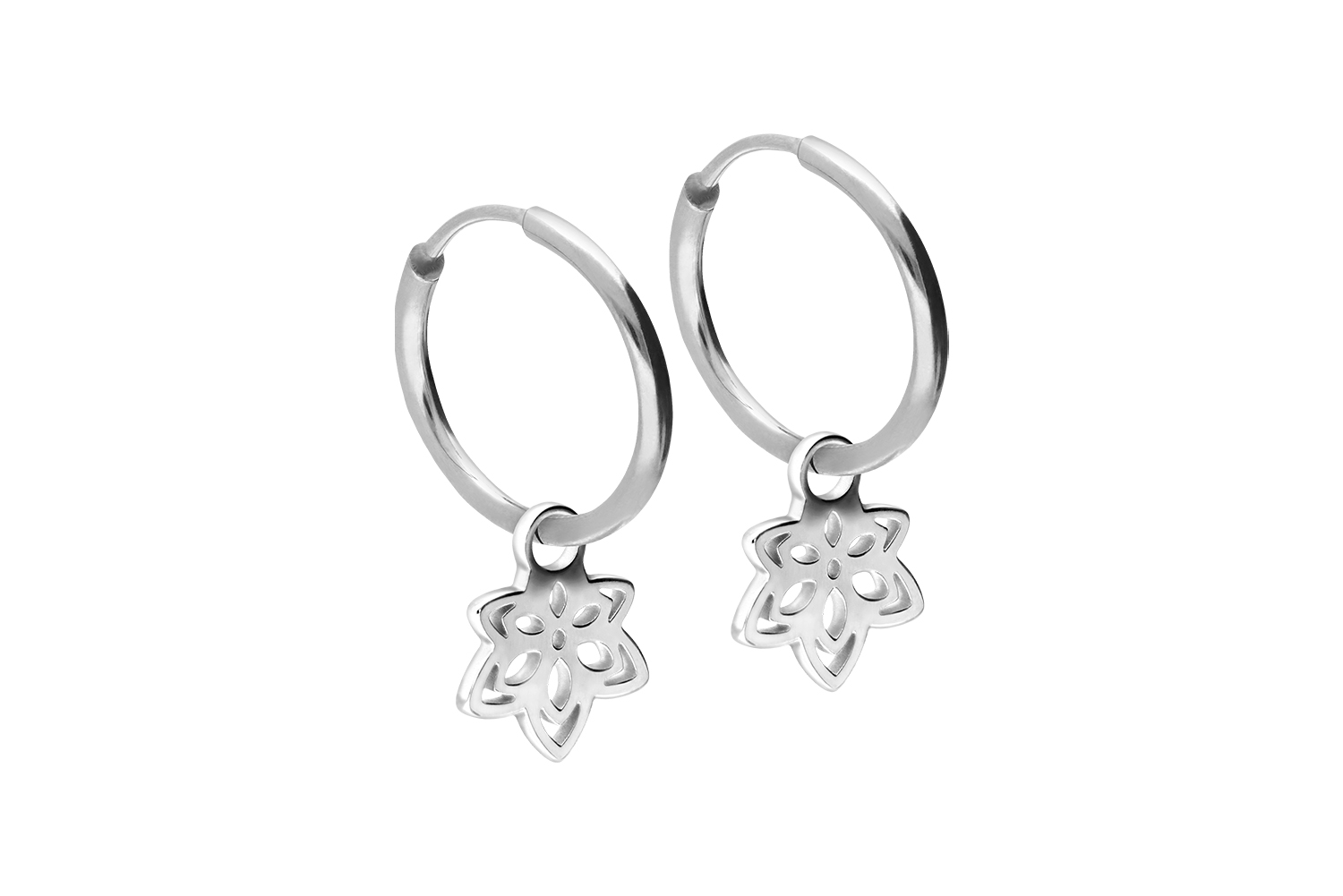 Farbe nach Wahl, die durch die Hochglanzpolitur zusätzlich veredelt wird. Als optisches Highlight ist jeweils ein Anhänger in Form einer Blüte an jeder Creole angebracht. Sie verfügen stets über eine Stabstärke von 0,8 mm, wohingegen ihre Designstärke je