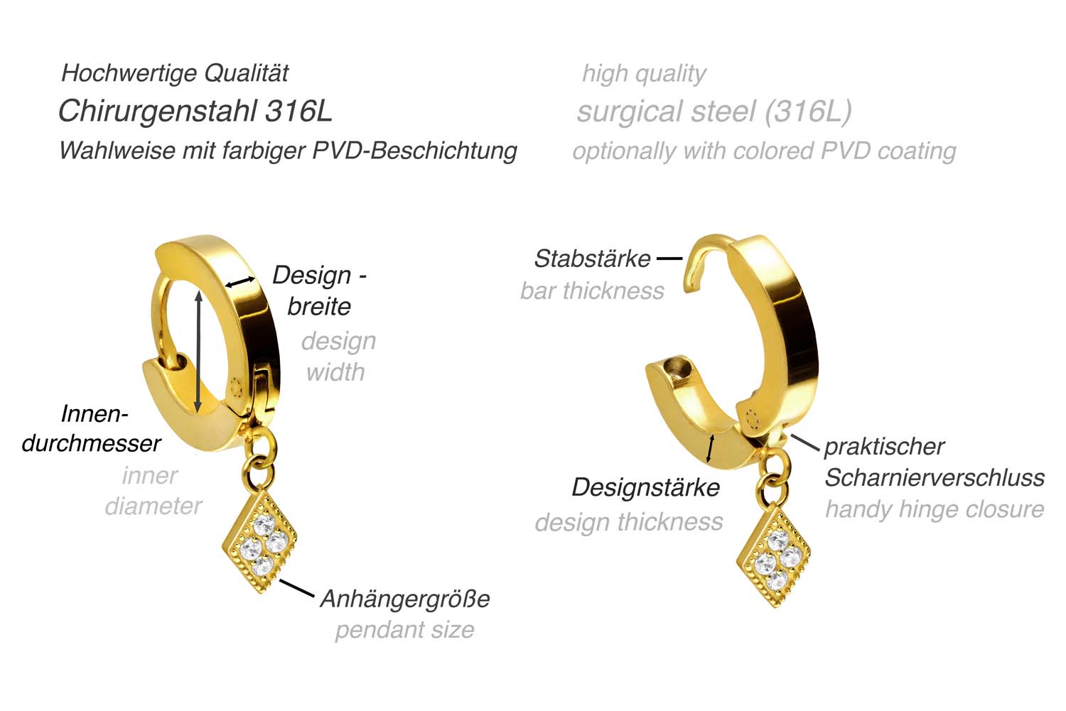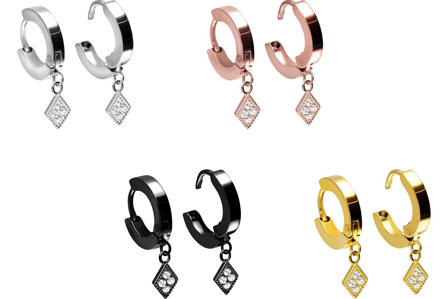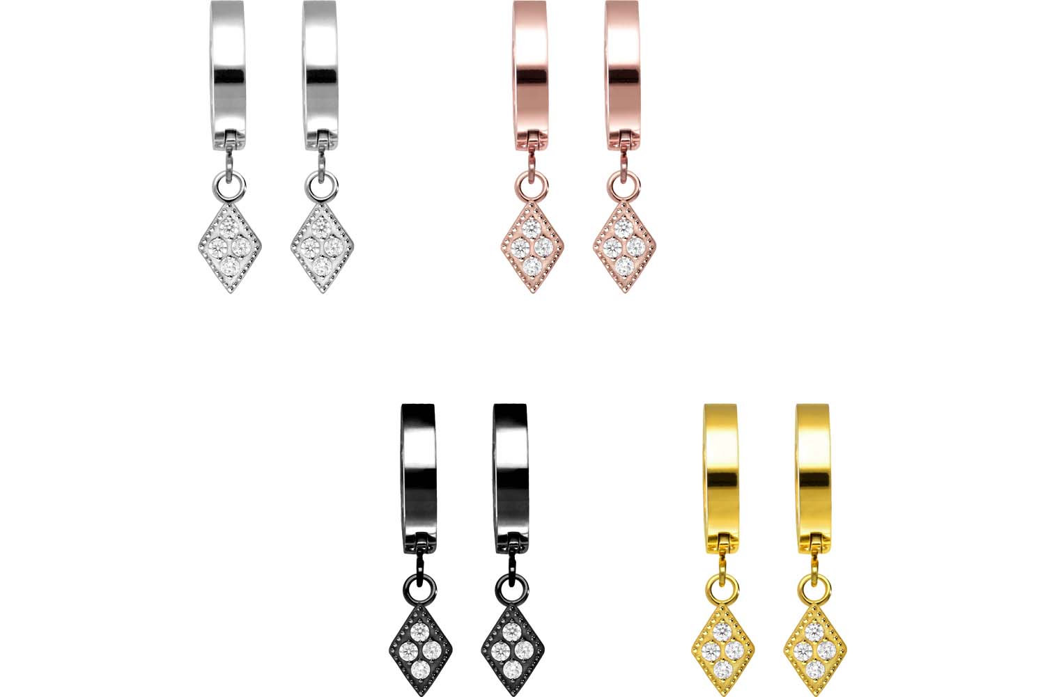 Diese zeitlos schönen Ohrclicker bestehen aus hochwertigem Chirurgenstahl 316L, zu dessen spezifischen Materialeigenschaften unter anderem hohe Beständigkeit und ebene Beschaffenheit zählen. Als charakteristisch für unsere Clicker gilt außerdem das praktische Scharnier, das den Einsatz der Schmuckstücke um ein Vielfaches erleichtert. Falls gewünscht, sorgt eine kratzfeste PVD-Beschichtung für eine kraftvolle Farbe nach Wahl, die durch die Hochglanzpolitur zusätzlich veredelt wird. Unabhängig davon beträgt die Stabstärke stets 1 mm und der Innendurchmesser 9 mm. Visuell überzeugen die edlen Creolen mithilfe der ansprechenden Anhänger in Form von kristallbesetzten Rauten, anhand derer man die Liebe zum Detail besonders gut erkennen kann. Darüber hinaus werden sie, wie abgebildet, paarweise geliefert.