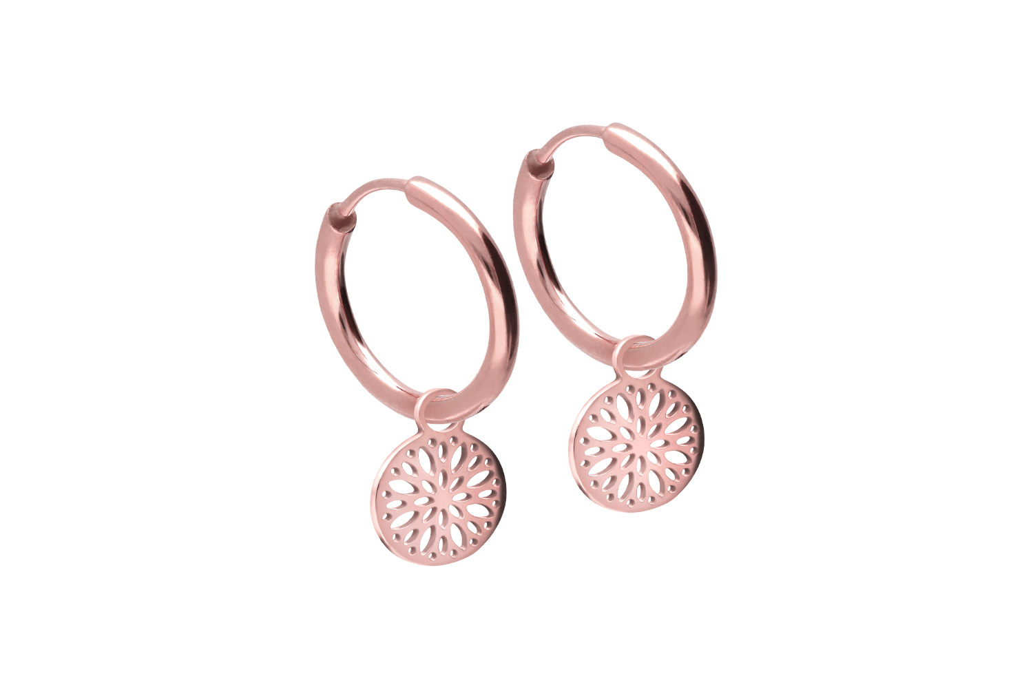 Farbe nach Wahl, die durch die Hochglanzpolitur zusätzlich veredelt wird. Als optisches Highlight ist jeweils ein Anhänger in Form eines Mandalas an jeder Creole angebracht. Sie verfügen stets über eine Stabstärke von 0,8 mm, wohingegen ihre Designstärke je nach persönlicher Vorliebe