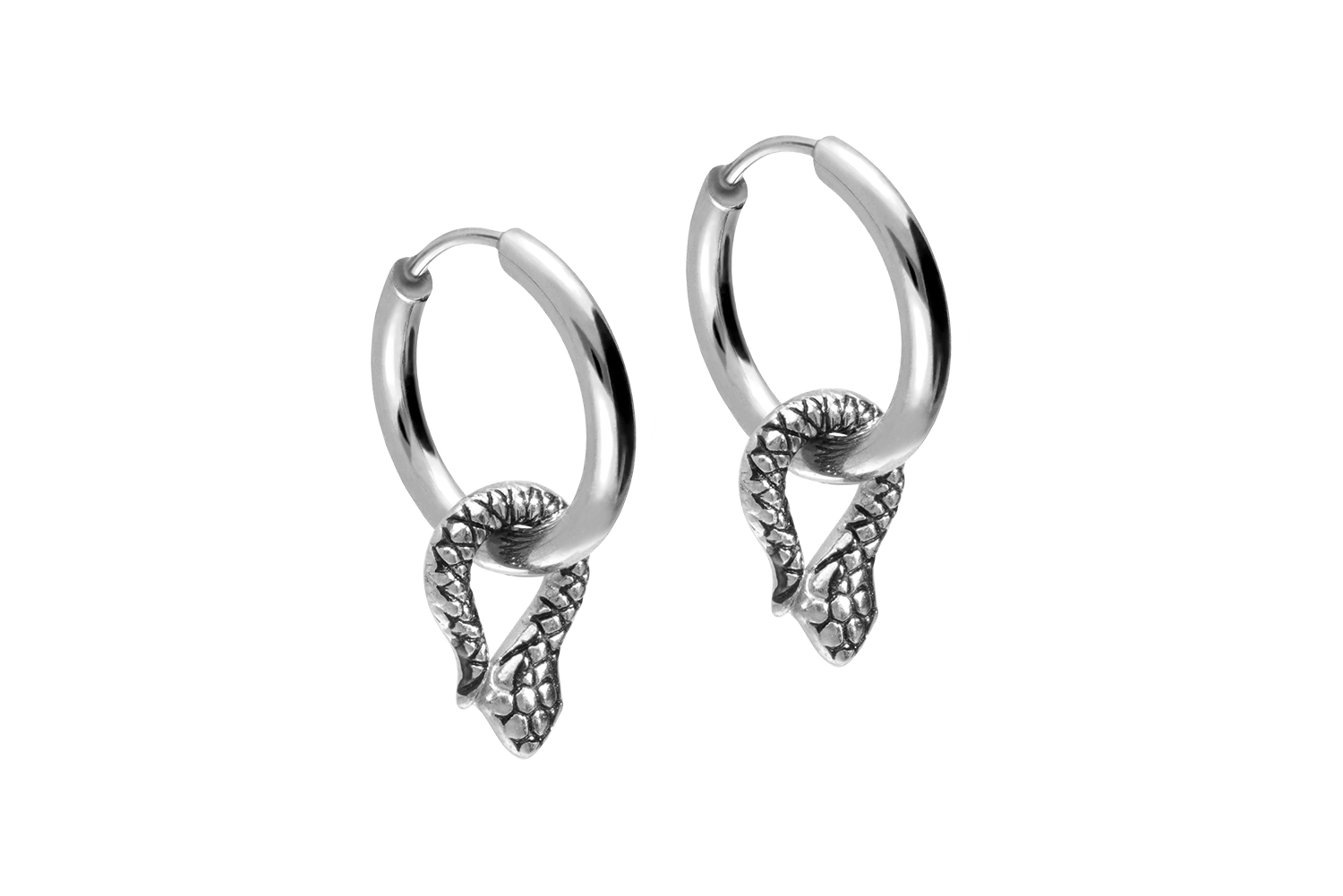 Farbe nach Wahl, die durch die Hochglanzpolitur zusätzlich veredelt wird. Als optisches Highlight ist jeweils ein Anhänger in Form einer Schlange an jeder Creole angebracht. Sie verfügen stets über eine Stabstärke von 0,8 mm, wohingegen ihre Designstärke je nach persönlicher