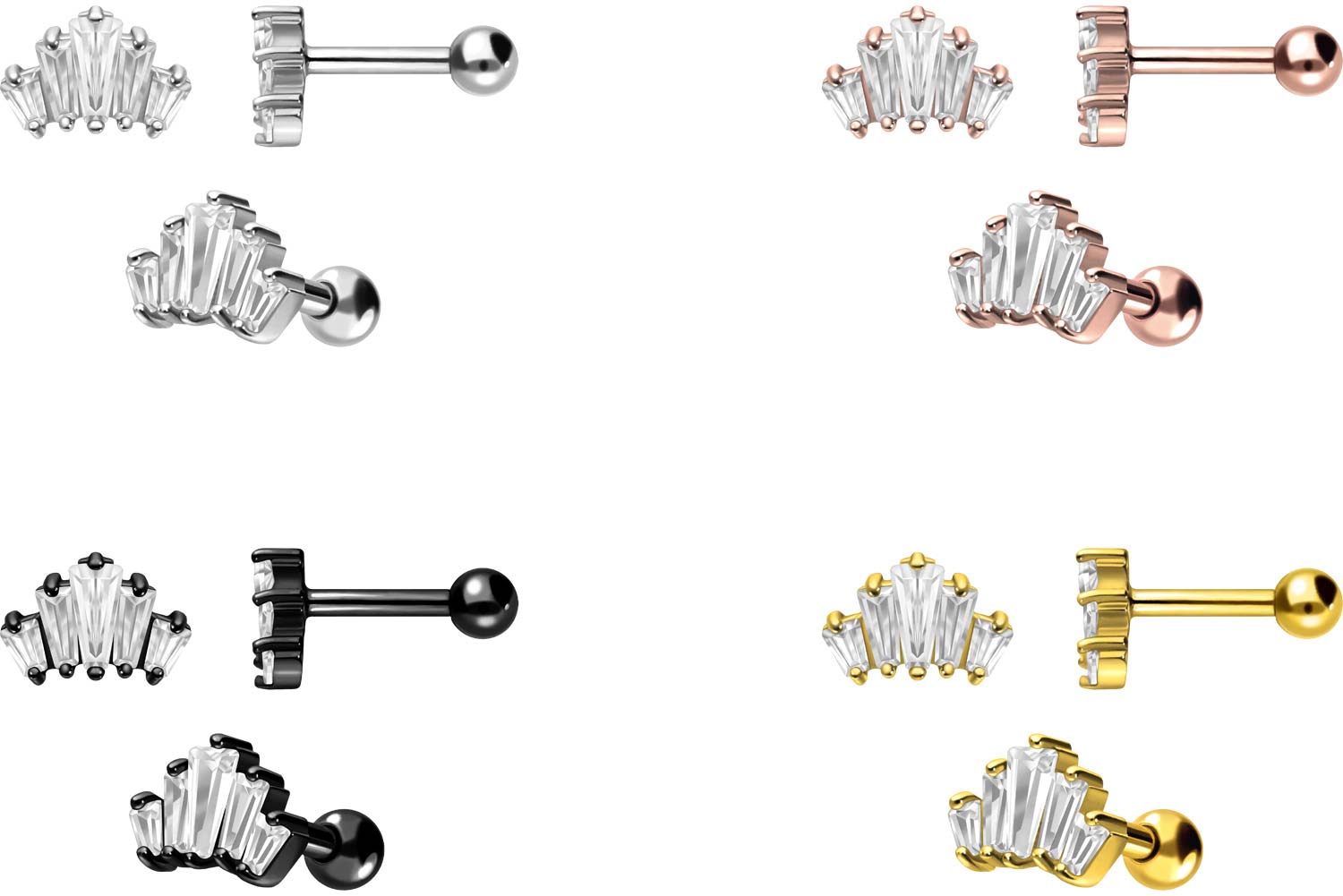 Dieses atemberaubend schöne Ohrpiercing besteht aus hochwertigem Chirurgenstahl 316L, der bekanntermaßen über Materialeigenschaften wie ebene Beschaffenheit und hohe Beständigkeit verfügt. Im Falle der schwarzen, gold- und roségoldfarbenen Variante ist er mit einer kratzfesten PVD-Beschichtung überzogen. Visuell überzeugt das Schmuckstück mithilfe der 5 funkelnden Kristallrechtecke mit Fassungen. Erhältlich ist das Ohrpiercing mit einer Stabstärke von 1,2 mm und einer Stablänge von 6 mm.
