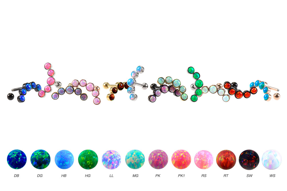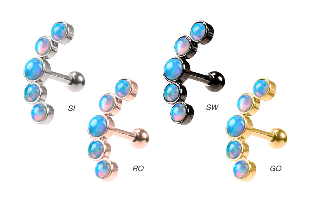 Dieses wunderschöne Ohrpiercing besticht durch sein zeitloses Design! Gekrönt wird dieses von den fünf eingefassten synthetischen Opalen, die das Schmuckstück zu einem absoluten Highlight machen. Jeder einzelne synthetische Opal ist das Ergebnis von monatelanger Handarbeit und ist sicher auch deswegen eine Augenweide die ihresgleichen sucht. Hierbei wurde ausschließlich hochwertiger Chirurgenstahl 316L verwendet und ist mit einer abriebfesten PVD-Beschichtung versehen. Die hohe Materialbeständigkeit und Farbechtheit dieses Materials sprechen deutlich für sich. Das Schmuckstück hat eine 1,2 mm Stabstärke und eine 6 mm Stablänge. Erhältlich ist es in drei verschiedenen Materialfarben sowie zwölf verschiedenen Opalfarben.