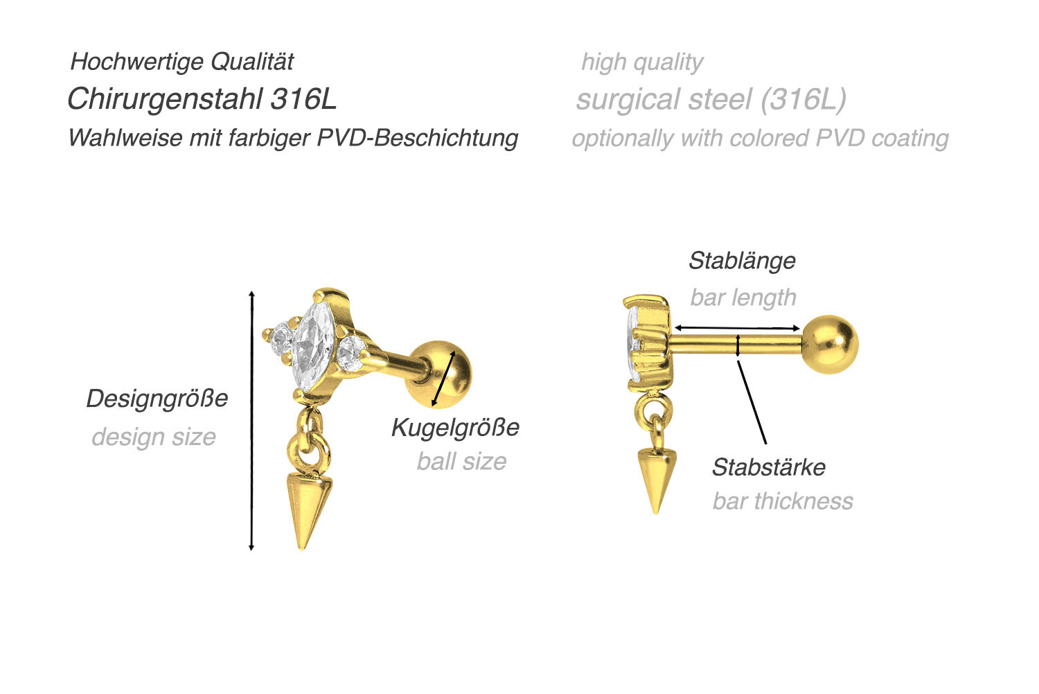 Dieses atemberaubend schöne Ohrpiercing besteht aus hochwertigem Chirurgenstahl 316L, der bekanntermaßen über Materialeigenschaften wie ebene Beschaffenheit und hohe Beständigkeit verfügt. Im Falle der schwarzen, gold- und roségoldfarbenen Variante ist er mit einer kratzfesten PVD-Beschichtung überzogen. Visuell überzeugt das Schmuckstück mithilfe der funkelnden Kristalle mit Fassungen, die zusätzlich mit einer Spitze verziert sind. Erhältlich ist das Ohrpiercing mit einer Stabstärke von 1,2 mm und einer Stablänge von 6 mm.