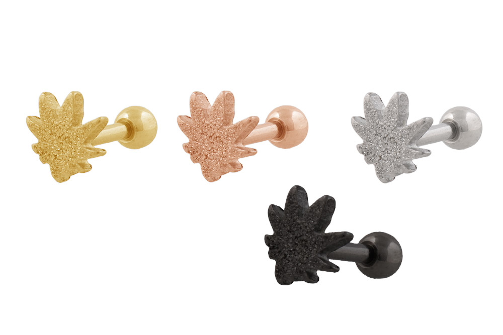 Dieses Hanfblatt in Diamantoptik sorgt garantiert für neugierige Blicke. Das Piercing besteht komplett aus hochwertigem Chirurgenstahl 316L und ist mit einer abriebfesten PVD-Beschichtung versehen. Dieses Material zeichnet sich durch seine besonderen Eigenschaften wie Farbechtheit und Materialbeständigkeit aus. Es hat eine 1,2 mm Stabstärke und eine 6 mm Stablänge. Erhältlich ist es in den Farben silber, gold, roségold und schwarz.