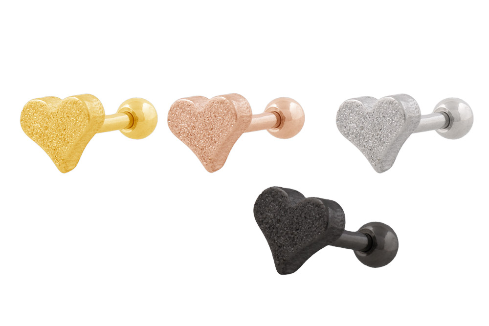 Ein Herz in Diamantoptik macht dieses Helixpiercing zu einem echten Schmuckstück. Es besteht komplett aus hochwertigem Chirurgenstahl 316L und ist mit einer abriebfesten PVD-Beschichtung versehen. Dieses Material zeichnet sich durch seine besonderen Eigenschaften wie Farbechtheit und Materialbeständigkeit aus. Es hat eine 1,2 mm Stabstärke und eine 6 mm Stablänge. Erhältlich ist es in den Farben silber, schwarz, gold und roségold.