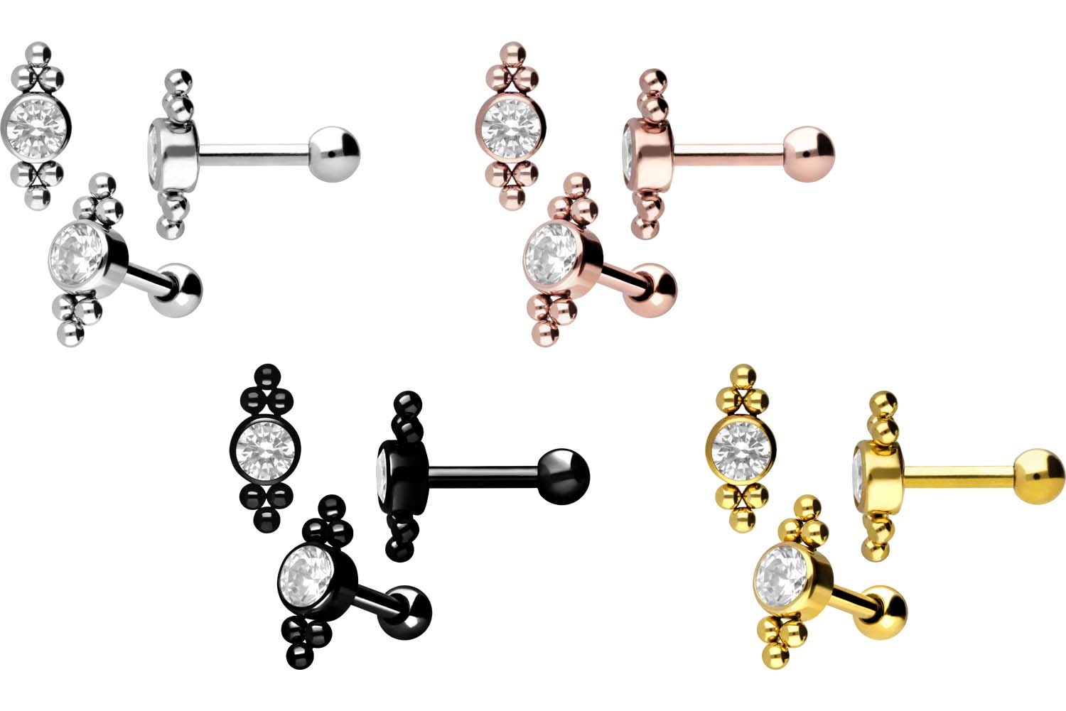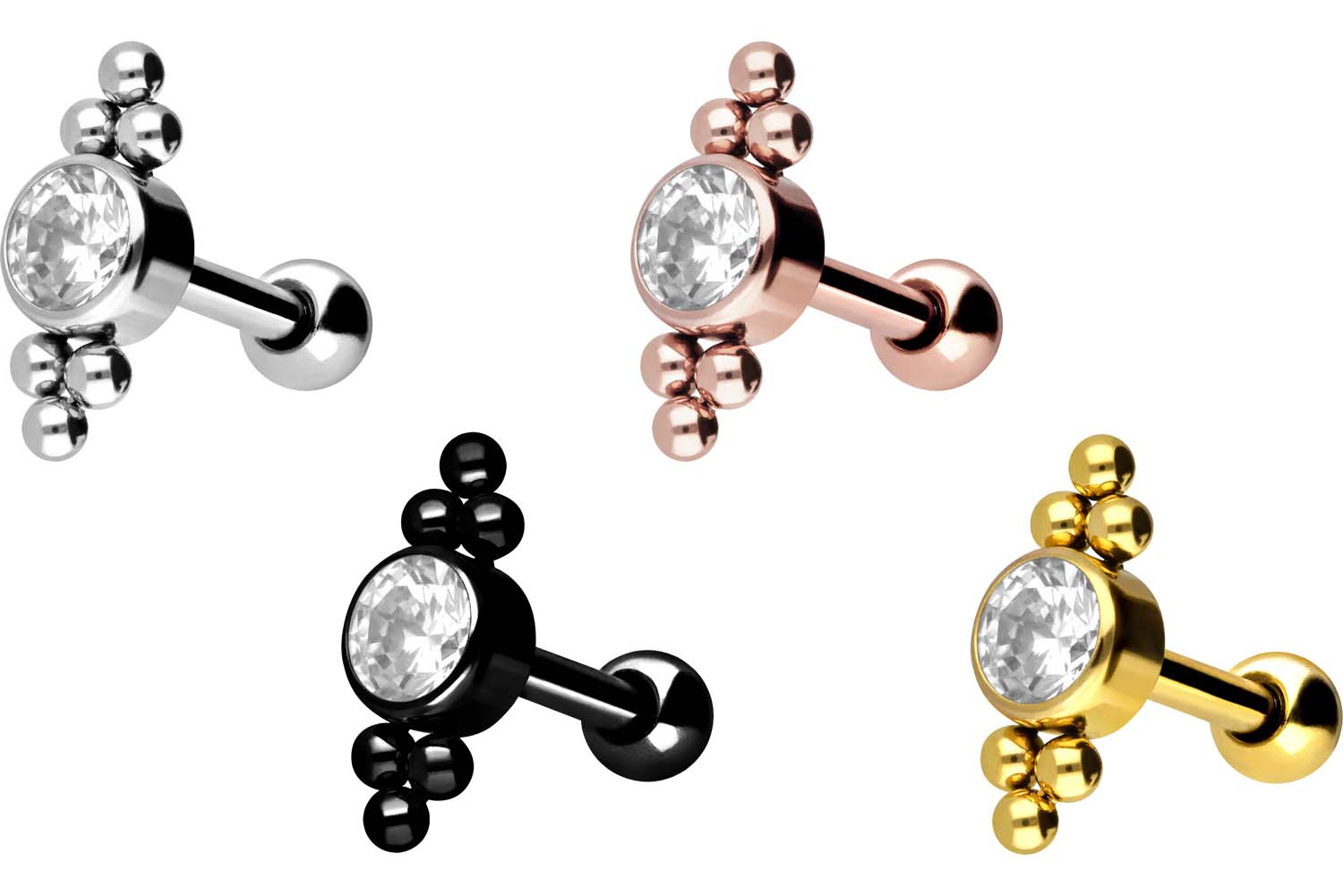 Dieses atemberaubend schöne Ohrpiercing besteht aus hochwertigem Chirurgenstahl 316L, der bekanntermaßen über Materialeigenschaften wie ebene Beschaffenheit und hohe Beständigkeit verfügt. Im Falle der schwarzen, gold- und roségoldfarbenen Variante ist er mit einer kratzfesten PVD-Beschichtung überzogen. Optisch überzeugt das edle Schmuckstück mittels geschickter Kombination aus funkelndem Kristall mit ein paar Kugeln. Deren stilvolle Anordnung um den Kristall herum verleiht dem schönen Ohrpiercing einen Hauch von Eleganz. Erhältlich ist es mit einer Stabstärke von 1,2 mm und einer Stablänge von 6 mm.