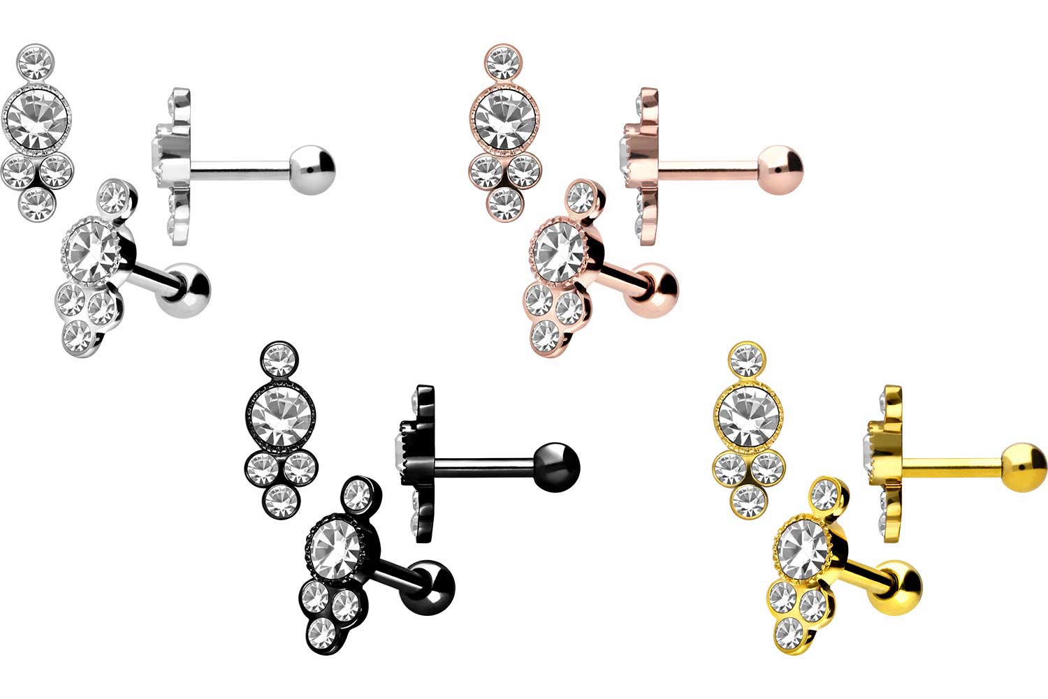 ebene Beschaffenheit und hohe Beständigkeit verfügt. Im Falle der schwarzen, gold- und roségoldfarbenen Variante ist er mit einer kratzfesten PVD-Beschichtung überzogen. Besonders ansprechend gestaltet ist das orientalische Design des Schmuckstücks, welches sich insbesondere durch die fünf funkelnden Kristalle in verschiedenen Größen auszeichnet. Erhältlich ist das Ohrpiercing mit einer Stabstärke von 1,2 mm und einer Stablänge von 6 mm.