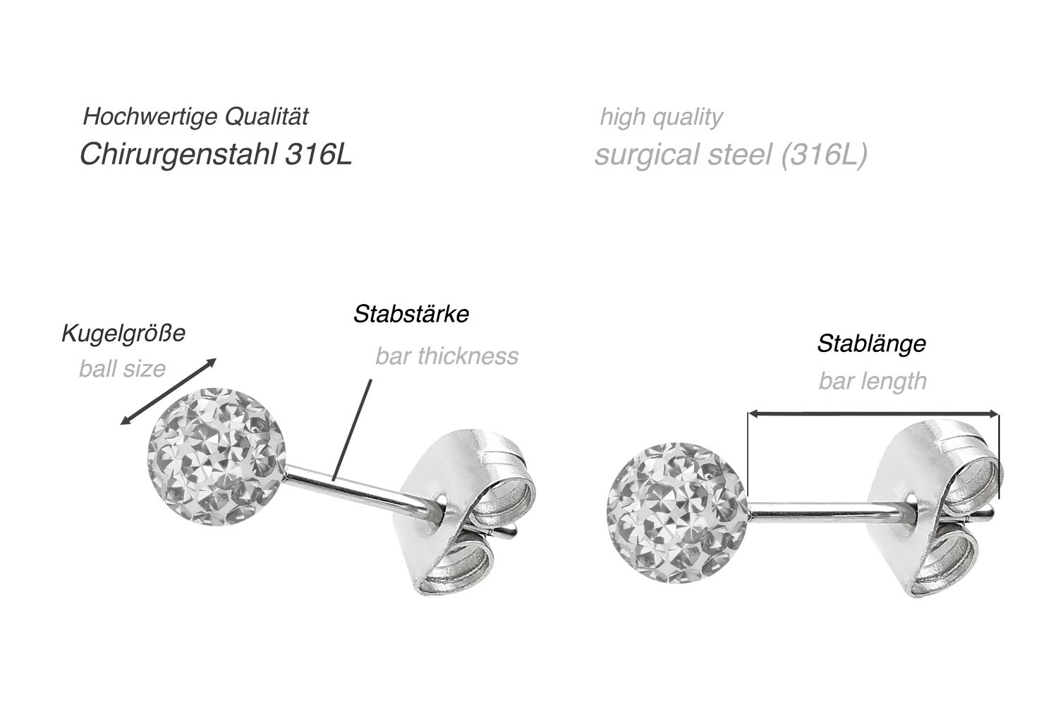 Diese stilvollen Ohrstecker sind aus Chirurgenstahl 316L gefertigt, der neben seiner hohen Qualität auch für Materialeigenschaften wie hohe Beständigkeit und Farbechtheit bekannt ist. Mit Hilfe der schimmernden Kristalle, die über die gesamten Kugeln verteilt sind und durch eine klare Epoxidharzschicht geschützt werden, erstrahlen die zeitlos schönen Ohrstecker in einer einzigartigen Brillanz. Darüber hinaus werden sie, wie abgebildet, paarweise geliefert.