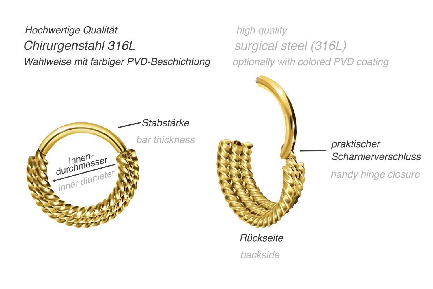 das Piercing mit einer kratzfesten PVD-Beschichtung überzogen. Als besonderes Highlight zieren das edle Schmuckstück drei gedrehte Ringe. Ob am Ohr, der Nase, oder der Lippe - unsere Clicker sind für die verschiedensten Piercingstellen geeignet. Dieser Clicker hat eine Stabstärke von 1,2 mm und ist mit einem Innendurchmesser von 7 mm erhältlich.