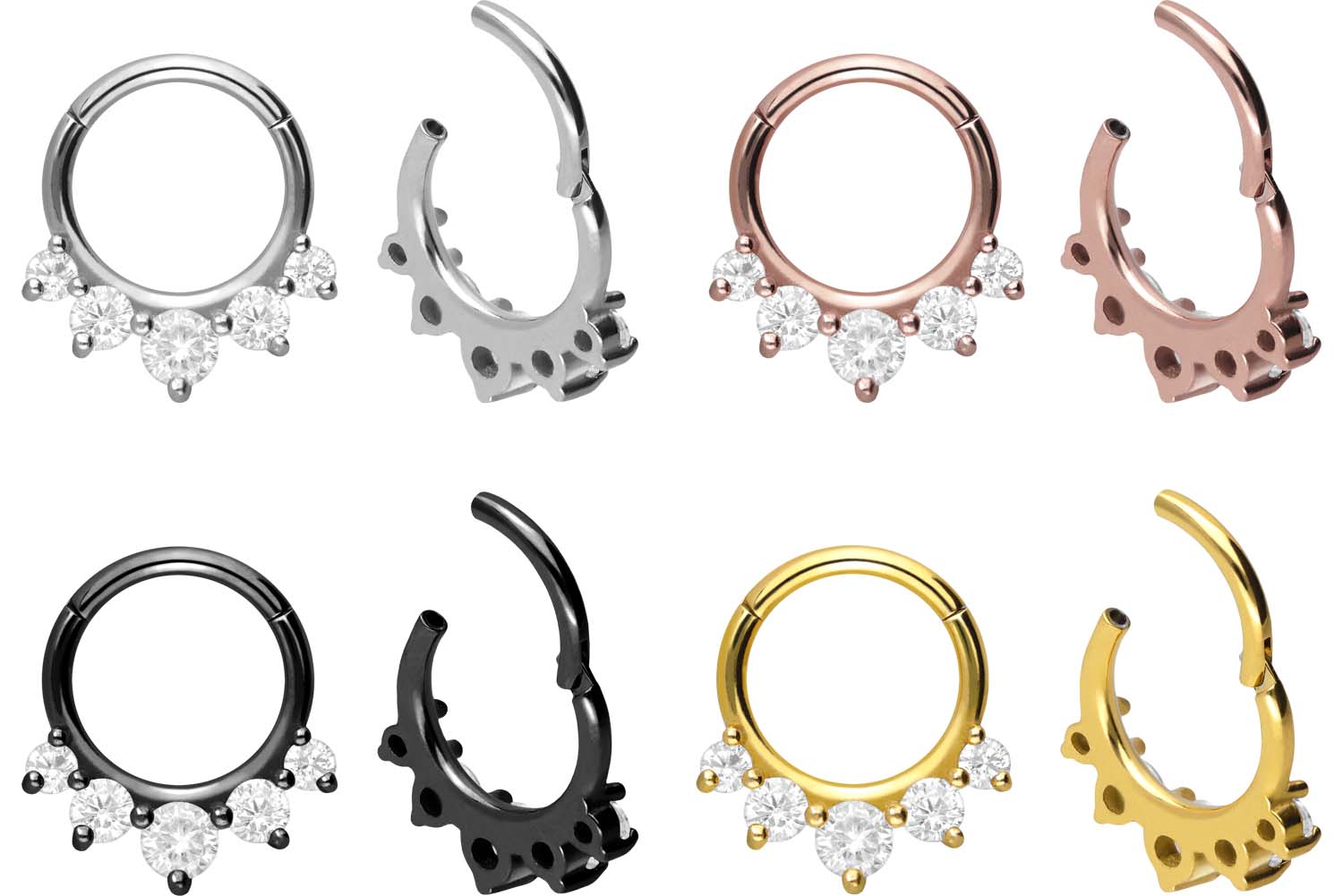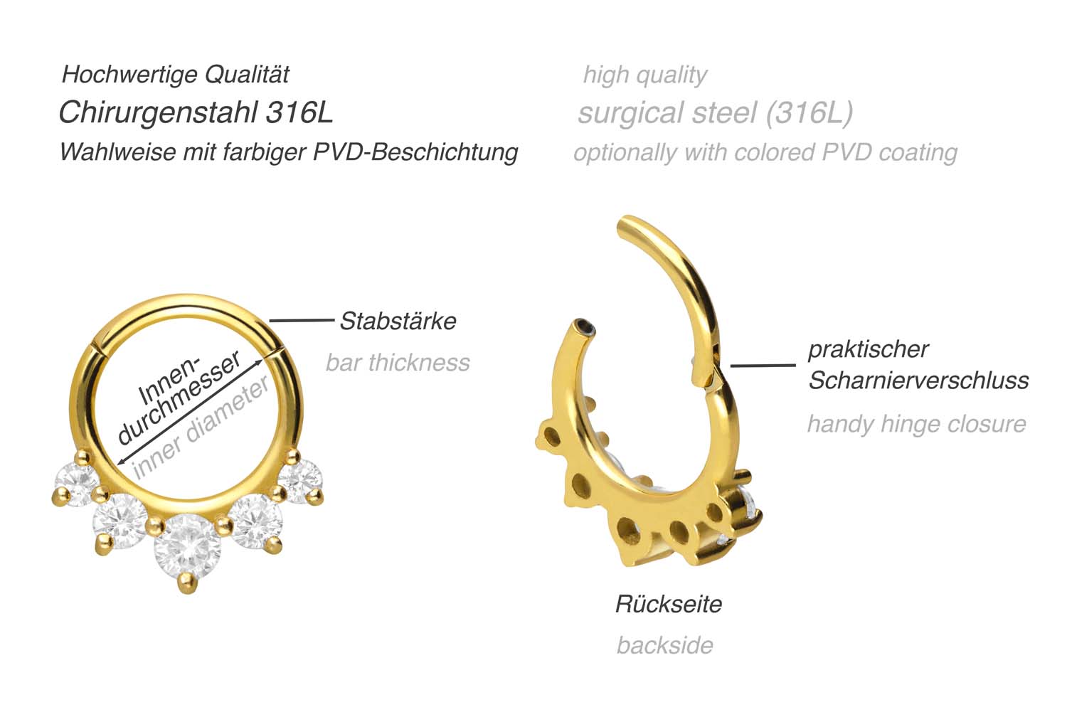das Piercing mit einer kratzfesten PVD-Beschichtung überzogen. Fünf glänzende Kristalle zieren den Clicker und verwandeln ihn in ein zeitlos schönes Accessoire. Ob am Ohr, der Nase, oder der Lippe – unsere Clicker sind