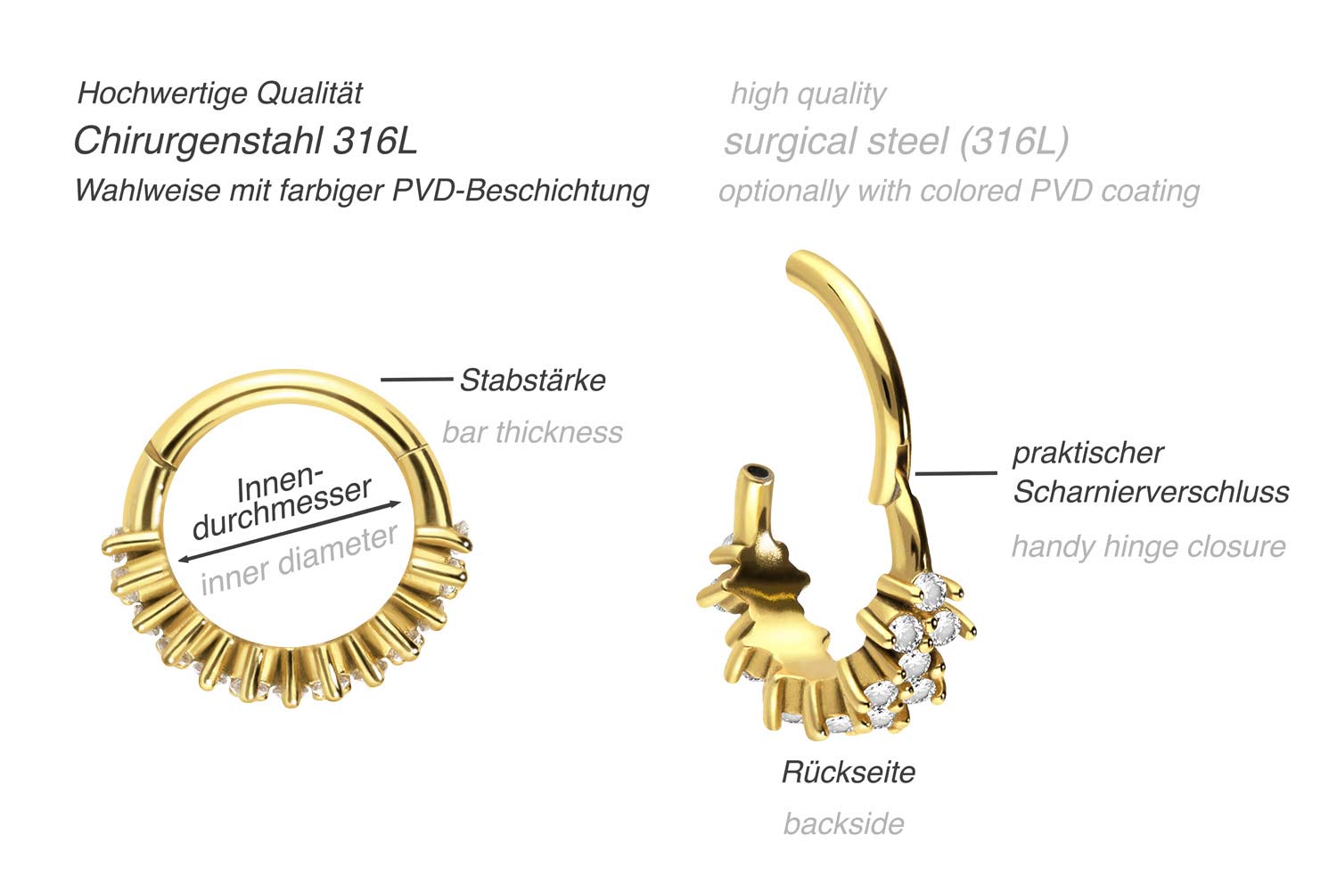 das Piercing mit einer kratzfesten PVD-Beschichtung überzogen. Als optisches Highlight dient der von außen sichtbare Rand des Schmuckstücks, da