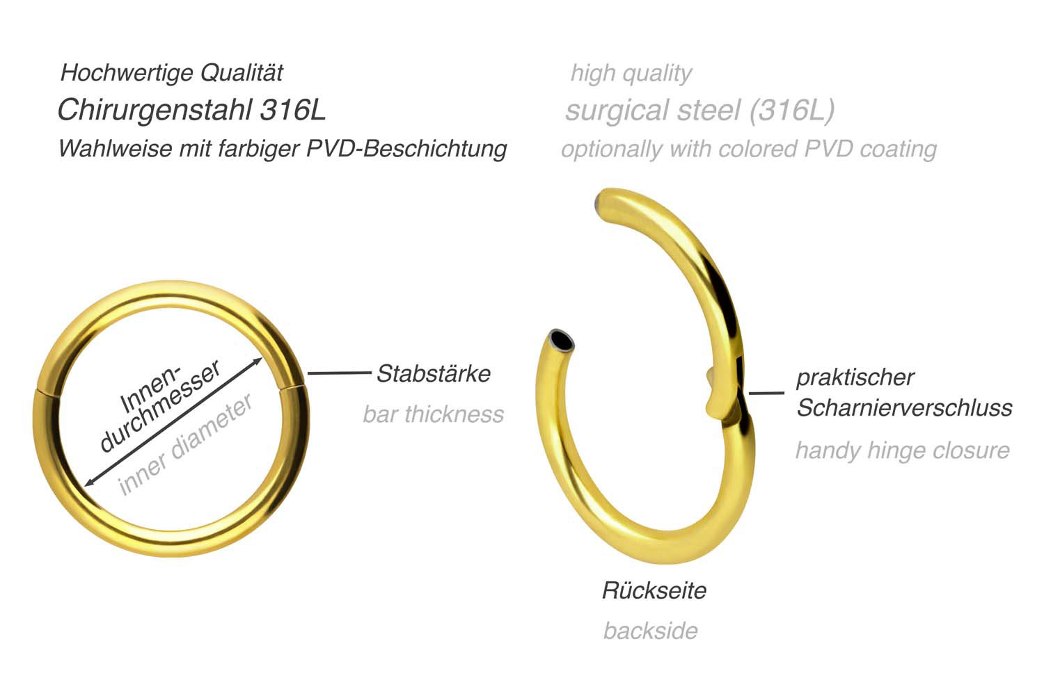 das Piercing mit einer kratzfesten PVD-Beschichtung überzogen. Sein ebenso zeitlos schönes, wie schlichtes Design ist ein echter Hingucker. Ob am Ohr, der Nase, oder der Lippe - unsere Clicker sind für die verschiedensten Piercingstellen geeignet. Dieser klassische Clicker ist in den unten aufgeführten Stabstärken und Innendurchmessern erhältlich.