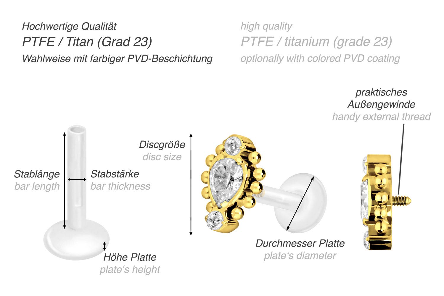 Dieses einzigartige Labret ist aus hochwertigem PTFE gefertigt, das ebenfalls unter dem Handelsnamen Teflon bekannt ist. Nur der Schraubaufsatz mit Außengewinde in Form von drei funkelnden Kristallen, welche mit mehreren Kugeln verziert sind, wurde anstelle dessen aus Titan gefertigt. Beide Materialien verfügen neben ihrer exzellenten Qualität auch über weitere nützliche Eigenschaften wie etwa besonders gute Hautveträglichkeit und Beständigkeit. PTFE betreffend kommen Flexibilität und Anpassungsfähigkeit hinzu. Letztere macht sich im Falle dieses Artikels dadurch bemerkbar, dass sich der Stab je nach Belieben mit einer gewöhnlichen Haushaltsschere kürzen lässt. Anschließend kann mithilfe des Aufsatzes ein neues Gewinde eingedreht werden, sodass weiterhin ein optimaler Halt gewährleistet wird. Zu den Vorzügen von Titan gehört Farbechtheit, die auch bei den farbigen Varianten