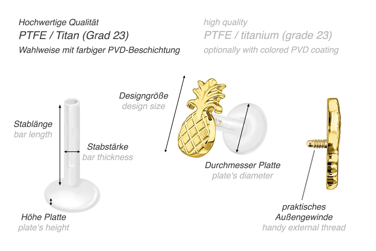Dieses einzigartige Labret ist aus hochwertigem PTFE gefertigt, das ebenfalls unter dem Handelsnamen Teflon bekannt ist. Nur der Schraubaufsatz mit Außengewinde in Form einer Ananas wurde anstelle dessen aus Titan gefertigt. Beide Materialien verfügen neben ihrer exzellenten Qualität auch über weitere nützliche Eigenschaften wie etwa besonders gute Hautveträglichkeit und Beständigkeit. PTFE betreffend kommen Flexibilität und Anpassungsfähigkeit hinzu. Letztere macht sich im Falle dieses Artikels dadurch bemerkbar, dass sich der Stab je nach Belieben mit einer gewöhnlichen Haushaltsschere kürzen lässt. Anschließend kann mithilfe des Aufsatzes ein neues Gewinde eingedreht werden, sodass weiterhin ein optimaler Halt gewährleistet wird. Zu den Vorzügen von Titan gehört Farbechtheit, die auch bei den farbigen Varianten