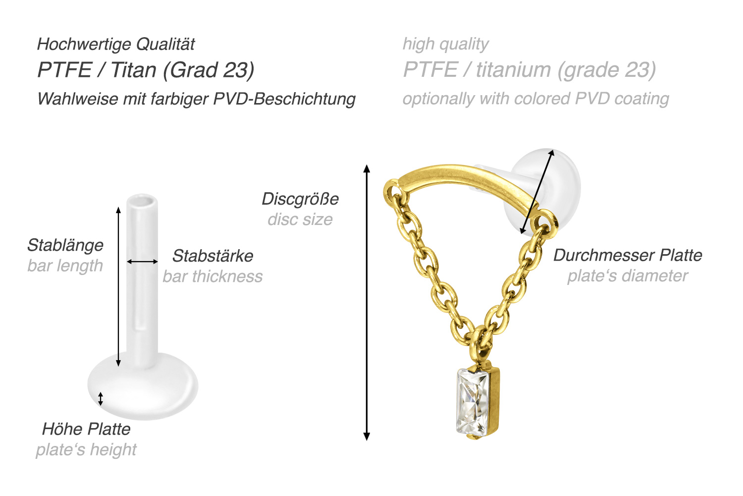 Dieses einzigartige Labret ist aus hochwertigem PTFE gefertigt, das ebenfalls unter dem Handelsnamen Teflon bekannt ist. Nur der Schraubaufsatz mit Außengewinde in Form eines Bogens, an welchem eine Kette mit einem beweglichen Kristallrechteck befestigt ist, wurde anstelle dessen aus Titan gefertigt. Beide Materialien verfügen neben ihrer exzellenten Qualität auch über weitere nützliche Eigenschaften wie etwa besonders gute Hautveträglichkeit und Beständigkeit. PTFE betreffend kommen Flexibilität und Anpassungsfähigkeit hinzu. Letztere macht sich im Falle dieses Artikels dadurch bemerkbar, dass sich der Stab je nach Belieben mit einer gewöhnlichen Haushaltsschere kürzen lässt. Anschließend kann mithilfe des Aufsatzes ein neues Gewinde eingedreht werden, sodass weiterhin ein optimaler Halt gewährleistet wird. Zu den Vorzügen von Titan gehört Farbechtheit, die auch bei den farbigen Varianten mit PVD-Beschichtung gewährleistet wird. Das Labret hat eine Stabstärke von entweder 1,2 oder 1,6 mm und ist in den unten aufgeführten Stablängen erhältlich. Darüber hinaus kann sein 0,9 mm Innengewinde nach Belieben mit all unseren anderen Schraubaufsätzen mit entsprechendem Außengewinde kombiniert werden.