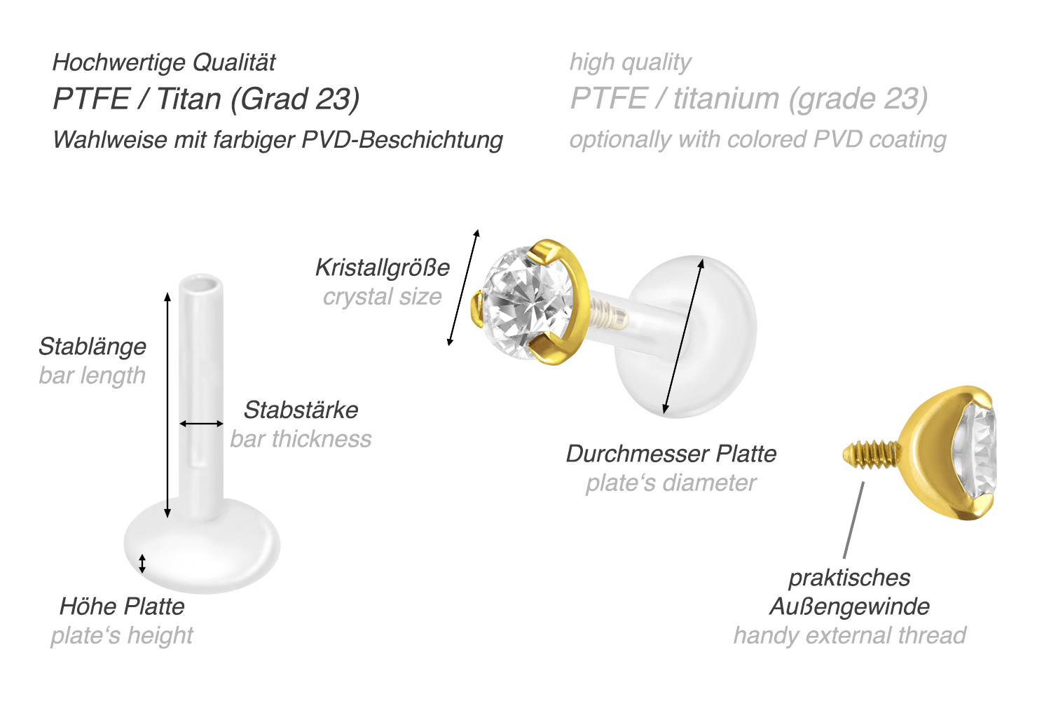 Dieses einzigartige Labret ist aus hochwertigem PTFE gefertigt, das ebenfalls unter dem Handelsnamen Teflon bekannt ist. Nur die Fassung mit Außengewinde wurde anstelle dessen aus Titan gefertigt. Ein wunderschön schimmernder Kristall lässt das Labret in voller Pracht erstrahlen. Beide Materialien verfügen neben ihrer exzellenten Qualität auch über weitere nützliche Eigenschaften wie etwa besonders gute Hautveträglichkeit und Beständigkeit. PTFE betreffend kommen Flexibilität und Anpassungsfähigkeit hinzu. Letztere macht sich im Falle dieses Artikels dadurch bemerkbar, dass sich der Stab je nach Belieben mit einer gewöhnlichen Haushaltsschere kürzen lässt. Anschließend kann mithilfe des Aufsatzes ein neues Gewinde eingedreht werden, sodass weiterhin ein optimaler Halt gewährleistet wird. Zu den Vorzügen von Titan gehört Farbechtheit, die auch bei den farbigen Varianten