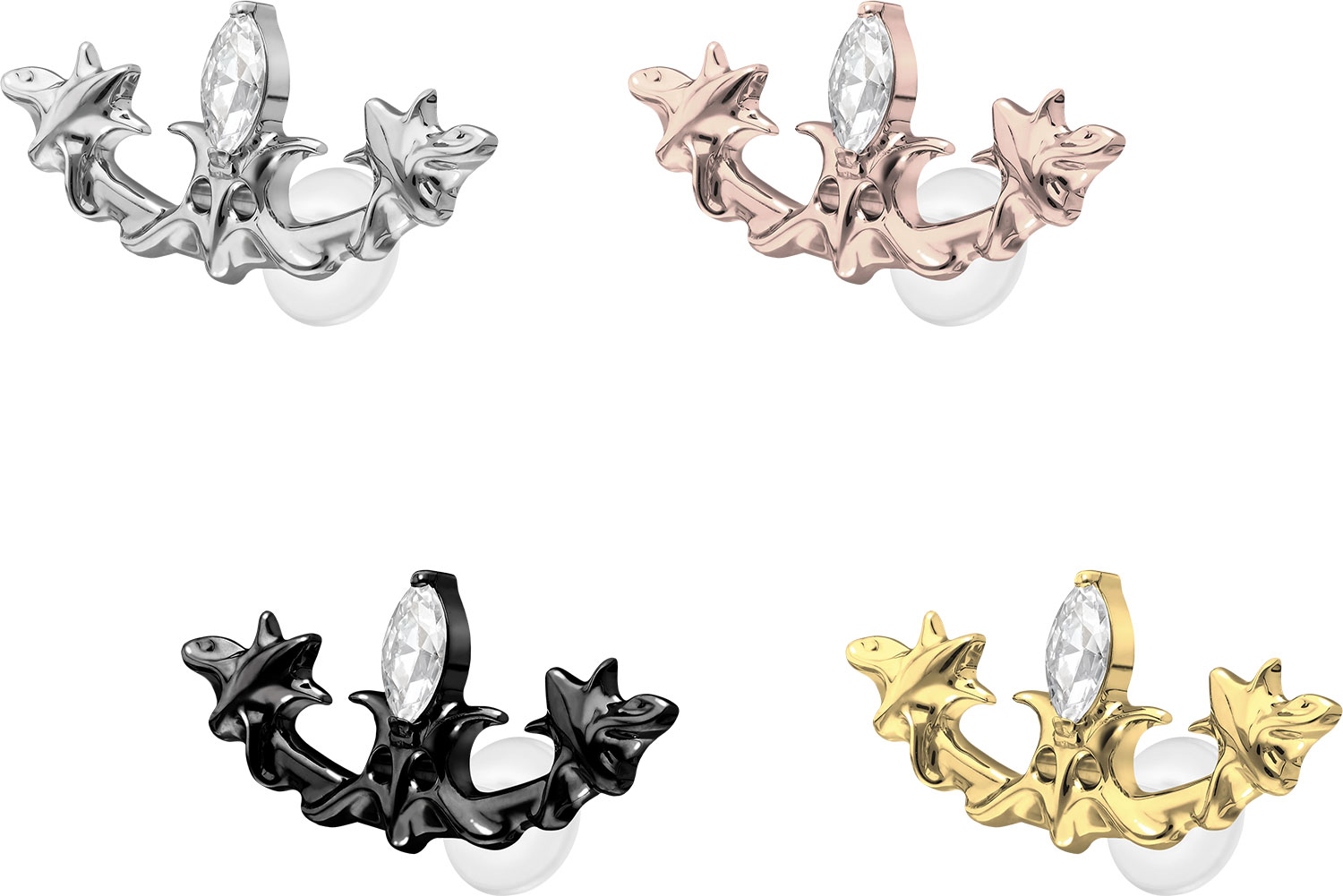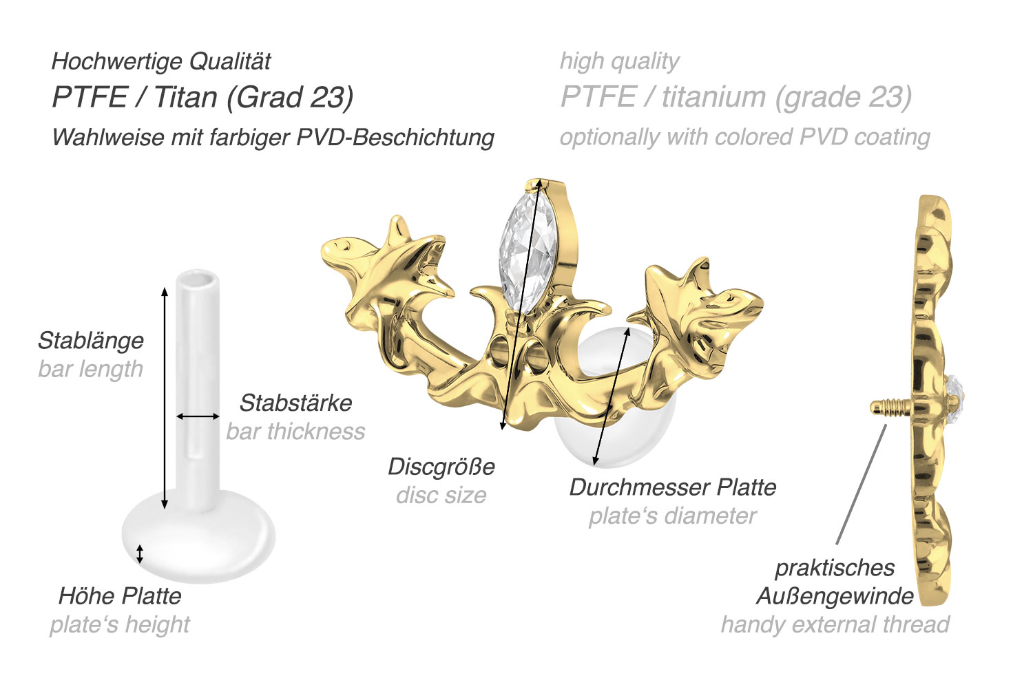 Dieses einzigartige Labret ist aus hochwertigem PTFE gefertigt, das ebenfalls unter dem Handelsnamen Teflon bekannt ist. Nur der Schraubaufsatz mit Außengewinde in Form eines gotischen Designs wurde anstelle dessen aus Titan gefertigt. Beide Materialien verfügen neben ihrer exzellenten Qualität auch über weitere nützliche Eigenschaften wie etwa besonders gute Hautveträglichkeit und Beständigkeit. PTFE betreffend kommen Flexibilität und Anpassungsfähigkeit hinzu. Letztere macht sich im Falle dieses Artikels dadurch bemerkbar, dass sich der Stab je nach Belieben mit einer gewöhnlichen Haushaltsschere kürzen lässt. Anschließend kann mithilfe des Aufsatzes ein neues Gewinde eingedreht werden, sodass weiterhin ein optimaler Halt gewährleistet wird. Zu den Vorzügen von Titan gehört Farbechtheit, die auch bei den farbigen Varianten mit PVD-Beschichtung gewährleistet wird. Das Labret hat eine Stabstärke von entweder 1,2 oder 1,6 mm und ist in den unten aufgeführten Stablängen erhältlich. Darüber hinaus kann sein 0,9 mm Innengewinde nach Belieben mit all unseren anderen Schraubaufsätzen mit entsprechendem Außengewinde kombiniert werden.