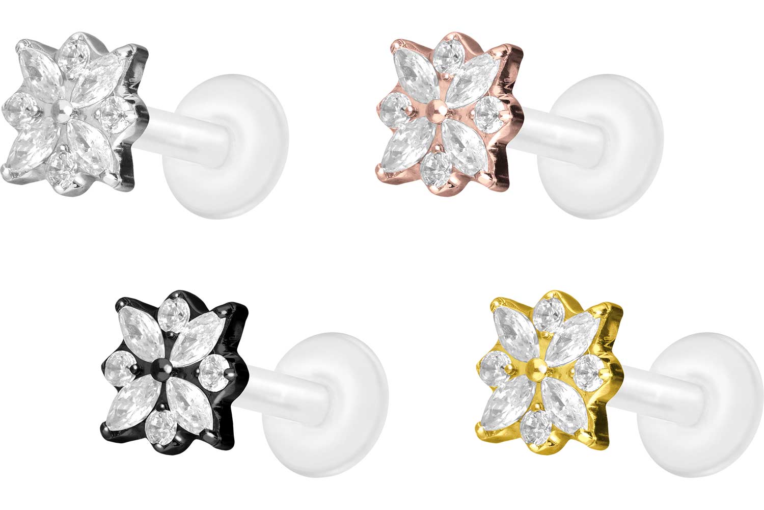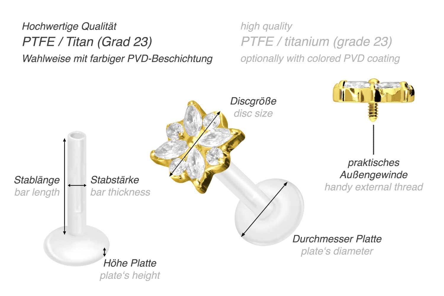 Dieses einzigartige Labret ist aus hochwertigem PTFE gefertigt, das ebenfalls unter dem Handelsnamen Teflon bekannt ist. Nur der Schraubaufsatz mit Außengewinde in Form einer funkelnden Kristallblume wurde anstelle dessen aus Titan gefertigt. Beide Materialien verfügen neben ihrer exzellenten Qualität auch über weitere nützliche Eigenschaften wie etwa besonders gute Hautveträglichkeit und Beständigkeit. PTFE betreffend kommen Flexibilität und Anpassungsfähigkeit hinzu. Letztere macht sich im Falle dieses Artikels dadurch bemerkbar, dass sich der Stab je nach Belieben mit einer gewöhnlichen Haushaltsschere kürzen lässt. Anschließend kann mithilfe des Aufsatzes ein neues Gewinde eingedreht werden, sodass weiterhin ein optimaler Halt gewährleistet wird. Zu den Vorzügen von Titan gehört Farbechtheit, die auch bei den farbigen Varianten