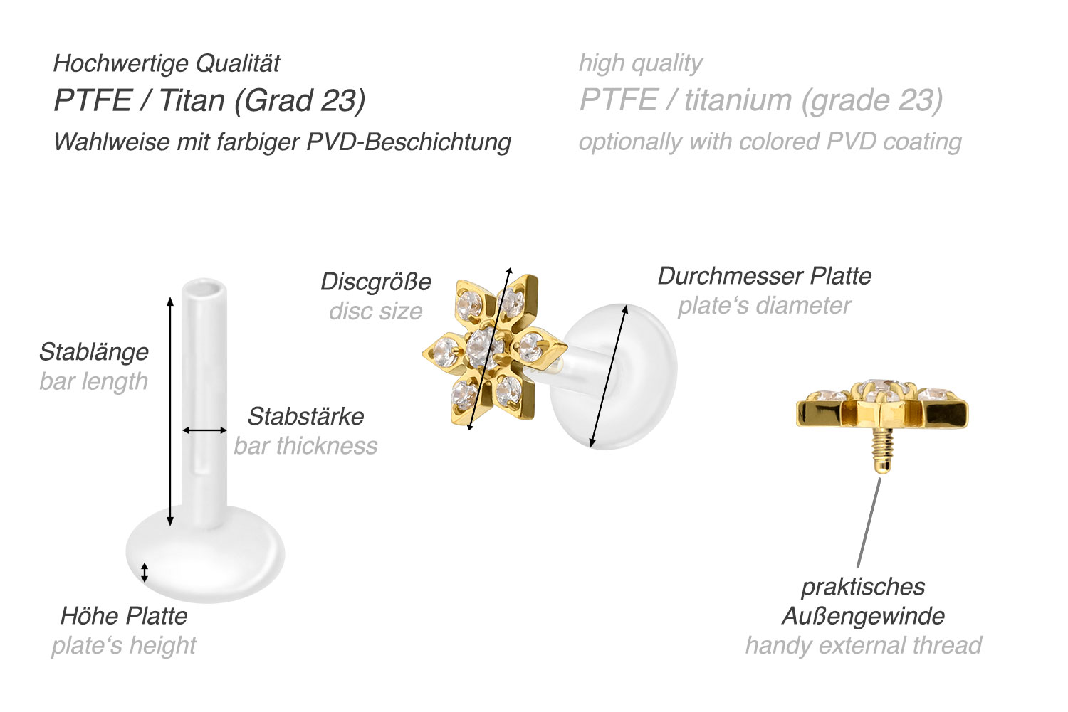 Dieses einzigartige Labret ist aus hochwertigem PTFE gefertigt, das ebenfalls unter dem Handelsnamen Teflon bekannt ist. Nur der Schraubaufsatz mit Außengewinde in Form einer Kristallblume wurde anstelle dessen aus Titan gefertigt. Beide Materialien verfügen neben ihrer exzellenten Qualität auch über weitere nützliche Eigenschaften wie etwa besonders gute Hautveträglichkeit und Beständigkeit. PTFE betreffend kommen Flexibilität und Anpassungsfähigkeit hinzu. Letztere macht sich im Falle dieses Artikels dadurch bemerkbar, dass sich der Stab je nach Belieben mit einer gewöhnlichen Haushaltsschere kürzen lässt. Anschließend kann mithilfe des Aufsatzes ein neues Gewinde eingedreht werden, sodass weiterhin ein optimaler Halt gewährleistet wird. Zu den Vorzügen von Titan gehört Farbechtheit, die auch bei den farbigen Varianten mit PVD-Beschichtung gewährleistet wird. Das Labret hat eine Stabstärke von entweder 1,2 oder 1,6 mm und ist in den unten aufgeführten Stablängen erhältlich. Darüber hinaus kann sein 0,9 mm Innengewinde nach Belieben mit all unseren anderen Schraubaufsätzen mit entsprechendem Außengewinde kombiniert werden.