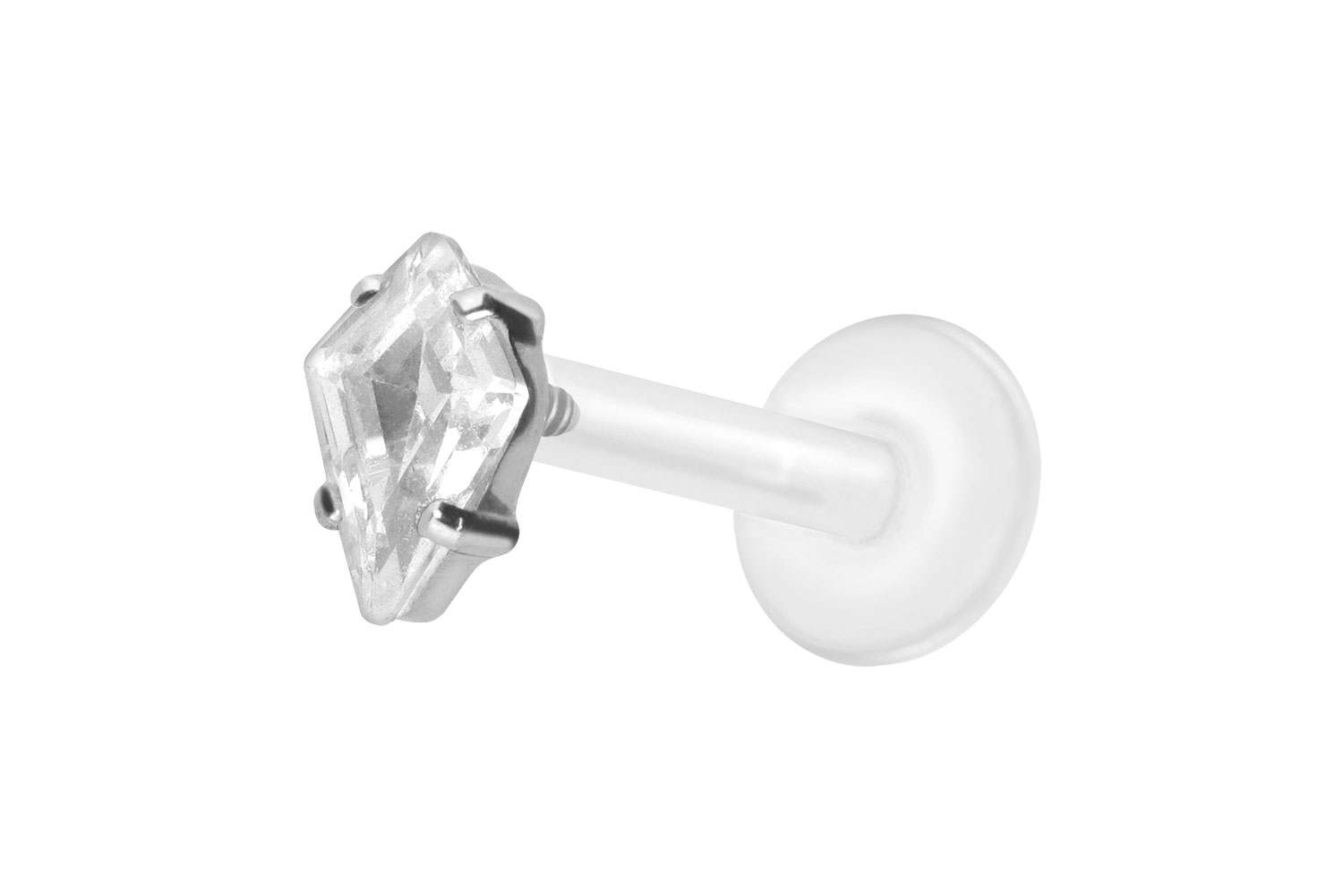 Dieses einzigartige Labret ist aus hochwertigem PTFE gefertigt, das ebenfalls unter dem Handelsnamen Teflon bekannt ist. Nur der Schraubaufsatz mit Außengewinde in Form einer funkelnden Kristallraute wurde anstelle dessen aus Titan gefertigt. Beide Materialien verfügen neben ihrer exzellenten Qualität auch über weitere nützliche Eigenschaften wie etwa besonders gute Hautveträglichkeit und Beständigkeit. PTFE betreffend kommen Flexibilität und Anpassungsfähigkeit hinzu. Letztere macht sich im Falle dieses Artikels dadurch bemerkbar, dass sich der Stab je nach Belieben mit einer gewöhnlichen Haushaltsschere kürzen lässt. Anschließend kann mithilfe des Aufsatzes ein neues Gewinde eingedreht werden, sodass weiterhin ein optimaler Halt gewährleistet wird. Zu den Vorzügen von Titan gehört Farbechtheit, die auch bei den farbigen Varianten