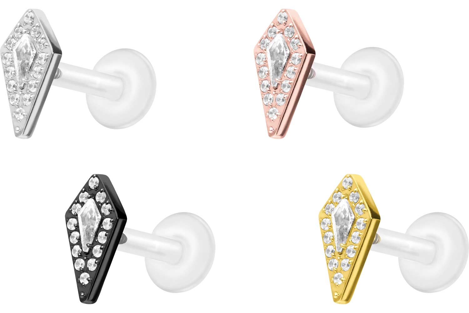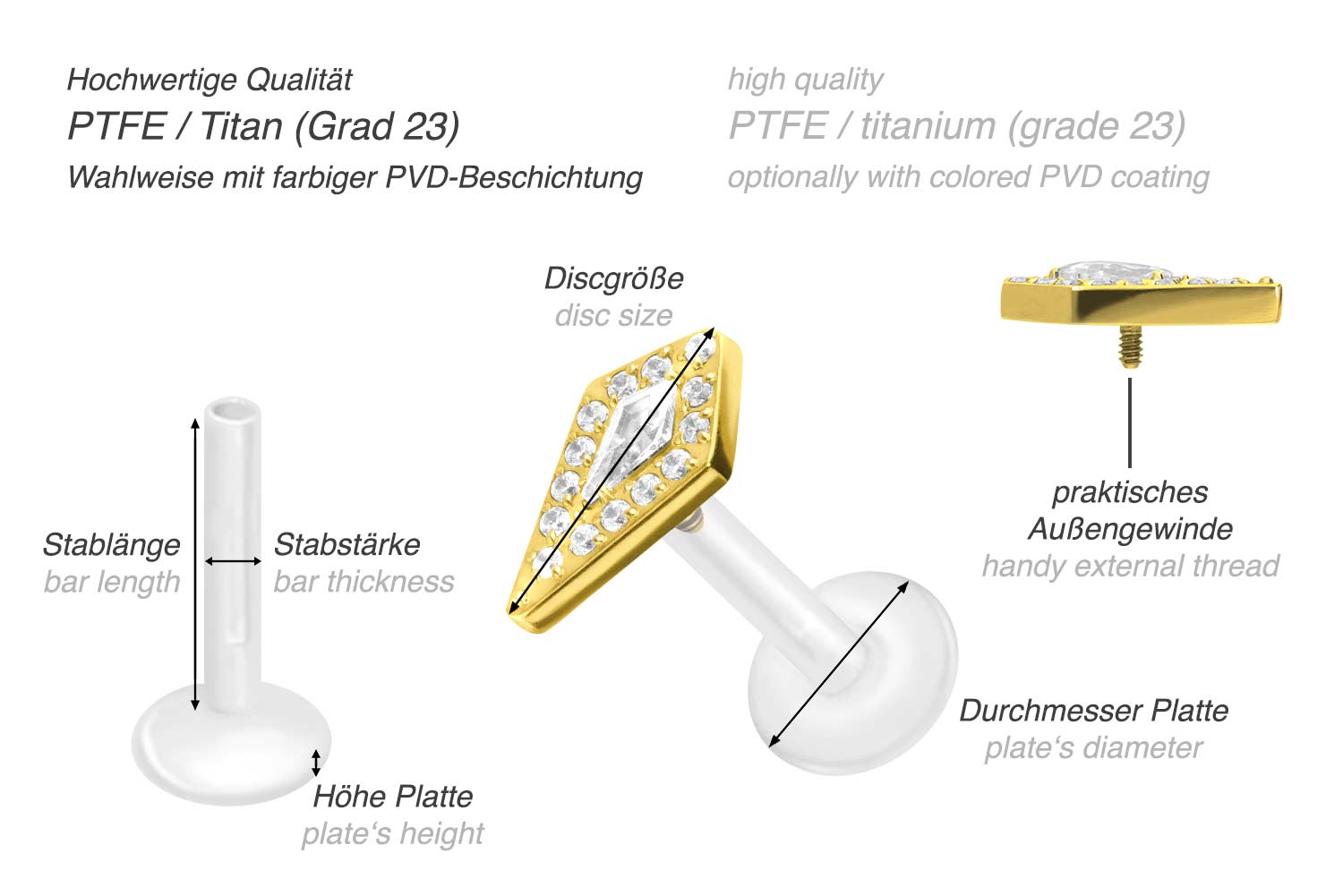 Dieses einzigartige Labret ist aus hochwertigem PTFE gefertigt, das ebenfalls unter dem Handelsnamen Teflon bekannt ist. Nur der Schraubaufsatz mit Außengewinde in Form eines funkelnden Kristallschilds wurde anstelle dessen aus Titan gefertigt. Beide Materialien verfügen neben ihrer exzellenten Qualität auch über weitere nützliche Eigenschaften wie etwa besonders gute Hautveträglichkeit und Beständigkeit. PTFE betreffend kommen Flexibilität und Anpassungsfähigkeit hinzu. Letztere macht sich im Falle dieses Artikels dadurch bemerkbar, dass sich der Stab je nach Belieben mit einer gewöhnlichen Haushaltsschere kürzen lässt. Anschließend kann mithilfe des Aufsatzes ein neues Gewinde eingedreht werden, sodass weiterhin ein optimaler Halt gewährleistet wird. Zu den Vorzügen von Titan gehört Farbechtheit, die auch bei den farbigen Varianten