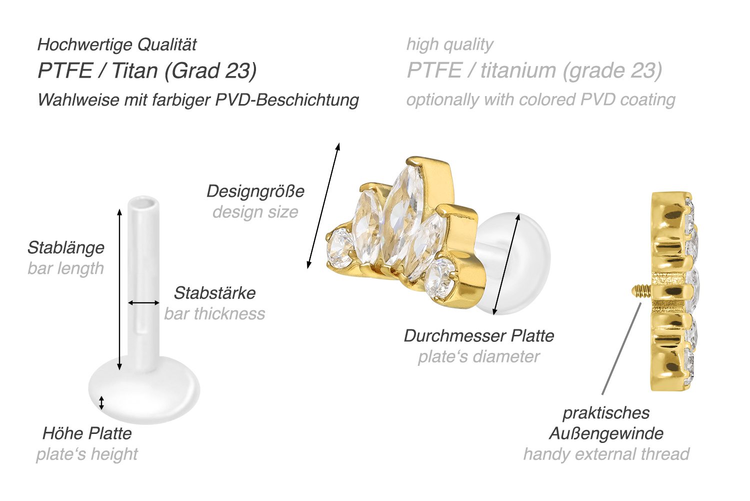 Dieses einzigartige Labret ist aus hochwertigem PTFE gefertigt, das ebenfalls unter dem Handelsnamen Teflon bekannt ist. Nur der Schraubaufsatz mit Außengewinde in Form einer funkelnden Lotusblüte wurde anstelle dessen aus Titan gefertigt. Beide Materialien verfügen neben ihrer exzellenten Qualität auch über weitere nützliche Eigenschaften wie etwa besonders gute Hautveträglichkeit und Beständigkeit. PTFE betreffend kommen Flexibilität und Anpassungsfähigkeit hinzu. Letztere macht sich im Falle dieses Artikels dadurch bemerkbar, dass sich der Stab je nach Belieben mit einer gewöhnlichen Haushaltsschere kürzen lässt. Anschließend kann mithilfe des Aufsatzes ein neues Gewinde eingedreht werden, sodass weiterhin ein optimaler Halt gewährleistet wird. Zu den Vorzügen von Titan gehört Farbechtheit, die auch bei den farbigen Varianten