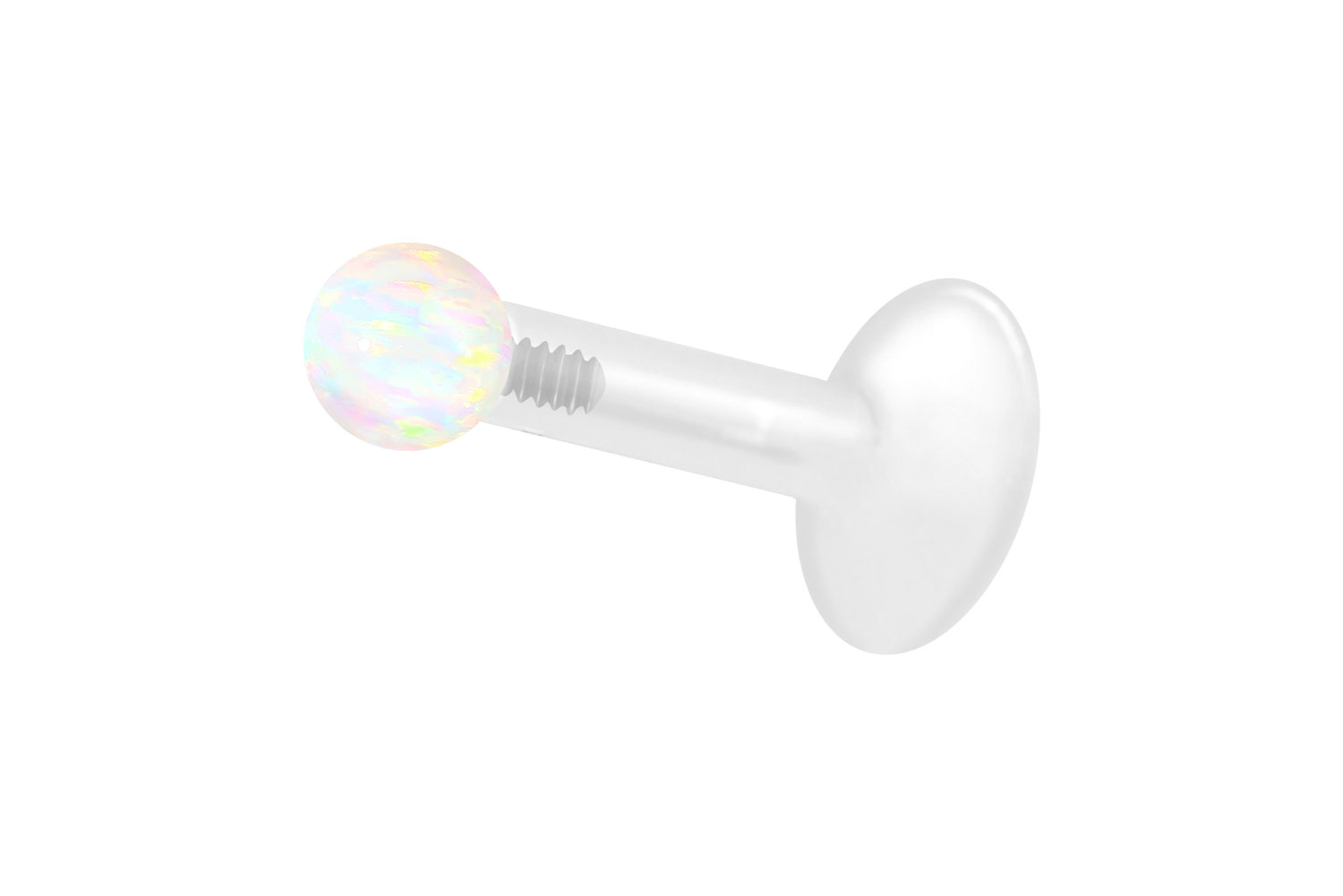 Dieses einzigartige Labret ist aus hochwertigem PTFE gefertigt, das ebenfalls unter dem Handelsnamen Teflon bekannt ist. Nur das Außengewinde des Schraubaufsatzes wurde anstelle dessen aus Titan gefertigt. Ein wunderschön schimmernder synthetischer Opal lässt das Labret in voller Pracht erstrahlen. Die Materialien verfügen neben ihrer exzellenten Qualität auch über weitere nützliche Eigenschaften wie etwa besonders gute Hautveträglichkeit und Beständigkeit. PTFE betreffend kommen Flexibilität und Anpassungsfähigkeit hinzu. Letztere macht sich im Falle dieses Artikels dadurch bemerkbar, dass sich der Stab je nach Belieben mit einer gewöhnlichen Haushaltsschere kürzen lässt. Anschließend kann mithilfe des Aufsatzes ein neues Gewinde eingedreht werden, sodass weiterhin ein optimaler Halt gewährleistet wird. Das Labret hat eine Stabstärke von entweder 1,2 oder 1,6 mm und ist in den