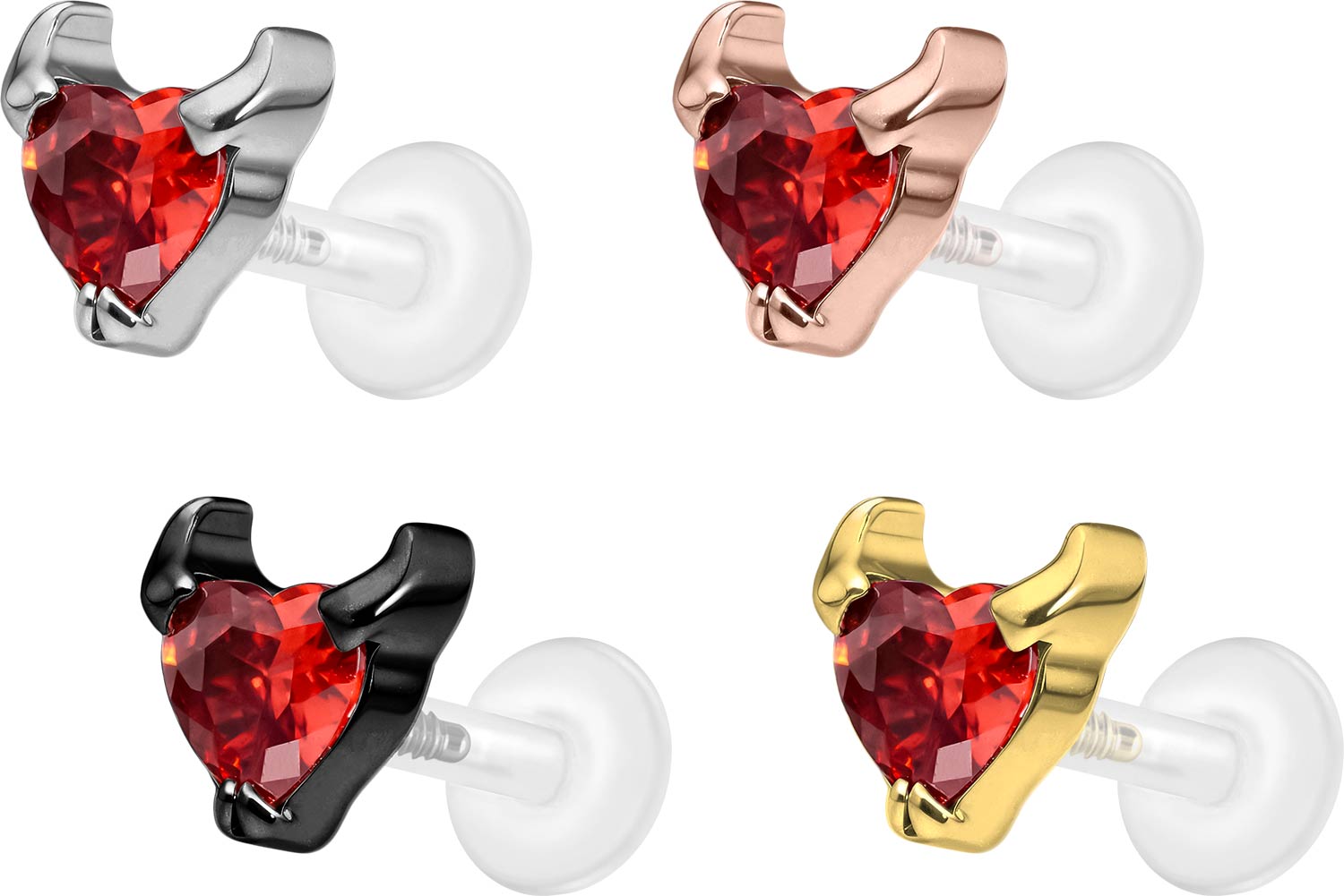 Dieses einzigartige Labret ist aus hochwertigem PTFE gefertigt, das ebenfalls unter dem Handelsnamen Teflon bekannt ist. Nur der Schraubaufsatz mit Außengewinde in Form eines Teufelsherzens wurde anstelle dessen aus Titan gefertigt. Beide Materialien verfügen neben ihrer exzellenten Qualität auch über weitere nützliche Eigenschaften wie etwa besonders gute Hautveträglichkeit und Beständigkeit. PTFE betreffend kommen Flexibilität und Anpassungsfähigkeit hinzu. Letztere macht sich im Falle dieses Artikels dadurch bemerkbar, dass sich der Stab je nach Belieben mit einer gewöhnlichen Haushaltsschere kürzen lässt. Anschließend kann mithilfe des Aufsatzes ein neues Gewinde eingedreht werden, sodass weiterhin ein optimaler Halt gewährleistet wird. Zu den Vorzügen von Titan gehört Farbechtheit, die auch bei den farbigen Varianten mit PVD-Beschichtung gewährleistet wird. Das Labret hat eine Stabstärke von entweder 1,2 oder 1,6 mm und ist in den unten aufgeführten Stablängen erhältlich. Darüber hinaus kann sein 0,9 mm Innengewinde nach Belieben mit all unseren anderen Schraubaufsätzen mit entsprechendem Außengewinde kombiniert werden.