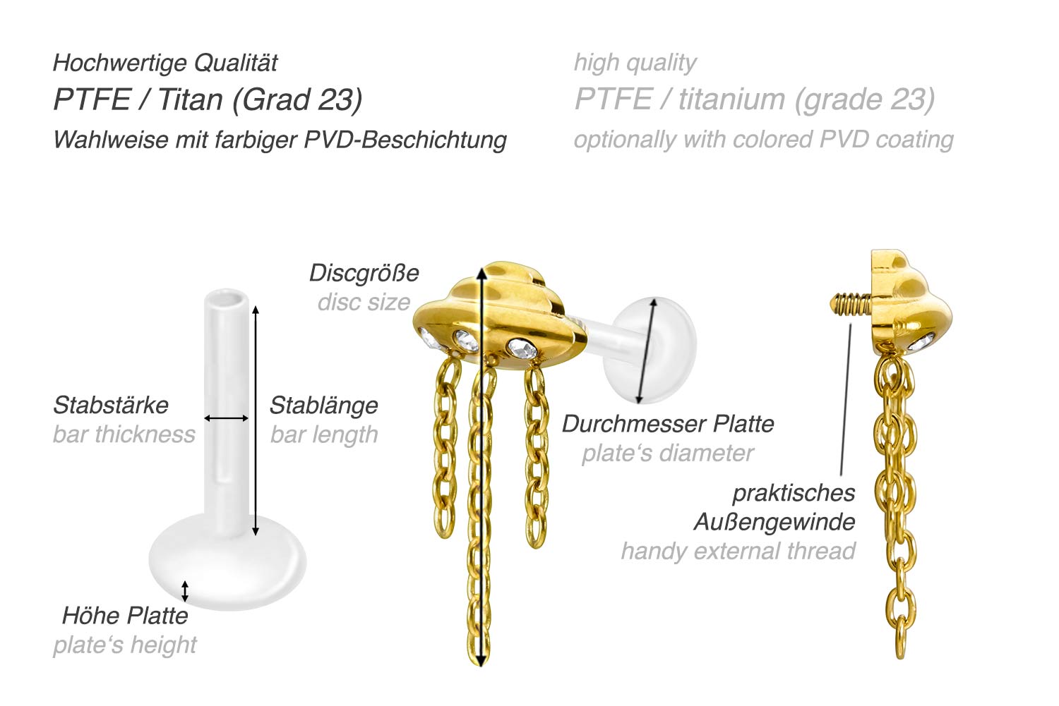 Dieses einzigartige Labret ist aus hochwertigem PTFE gefertigt, das ebenfalls unter dem Handelsnamen Teflon bekannt ist. Nur der Schraubaufsatz mit Außengewinde in Form eines Ufos, welches mit mehreren Ketten und Kristallen verziehrt ist, wurde anstelle dessen aus Titan gefertigt. Beide Materialien verfügen neben ihrer exzellenten Qualität auch über weitere nützliche Eigenschaften wie etwa besonders gute Hautveträglichkeit und Beständigkeit. PTFE betreffend kommen Flexibilität und Anpassungsfähigkeit hinzu. Letztere macht sich im Falle dieses Artikels dadurch bemerkbar, dass sich der Stab je nach Belieben mit einer gewöhnlichen Haushaltsschere kürzen lässt. Anschließend kann mithilfe des Aufsatzes ein neues Gewinde eingedreht werden, sodass weiterhin ein optimaler Halt gewährleistet wird. Zu den Vorzügen von Titan gehört Farbechtheit, die auch bei den farbigen Varianten mit PVD-Beschichtung gewährleistet wird. Das Labret hat eine Stabstärke von entweder 1,2 oder 1,6 mm und ist in den unten aufgeführten Stablängen erhältlich. Darüber hinaus kann sein 0,9 mm Innengewinde nach Belieben mit all unseren anderen Schraubaufsätzen mit entsprechendem Außengewinde kombiniert werden.