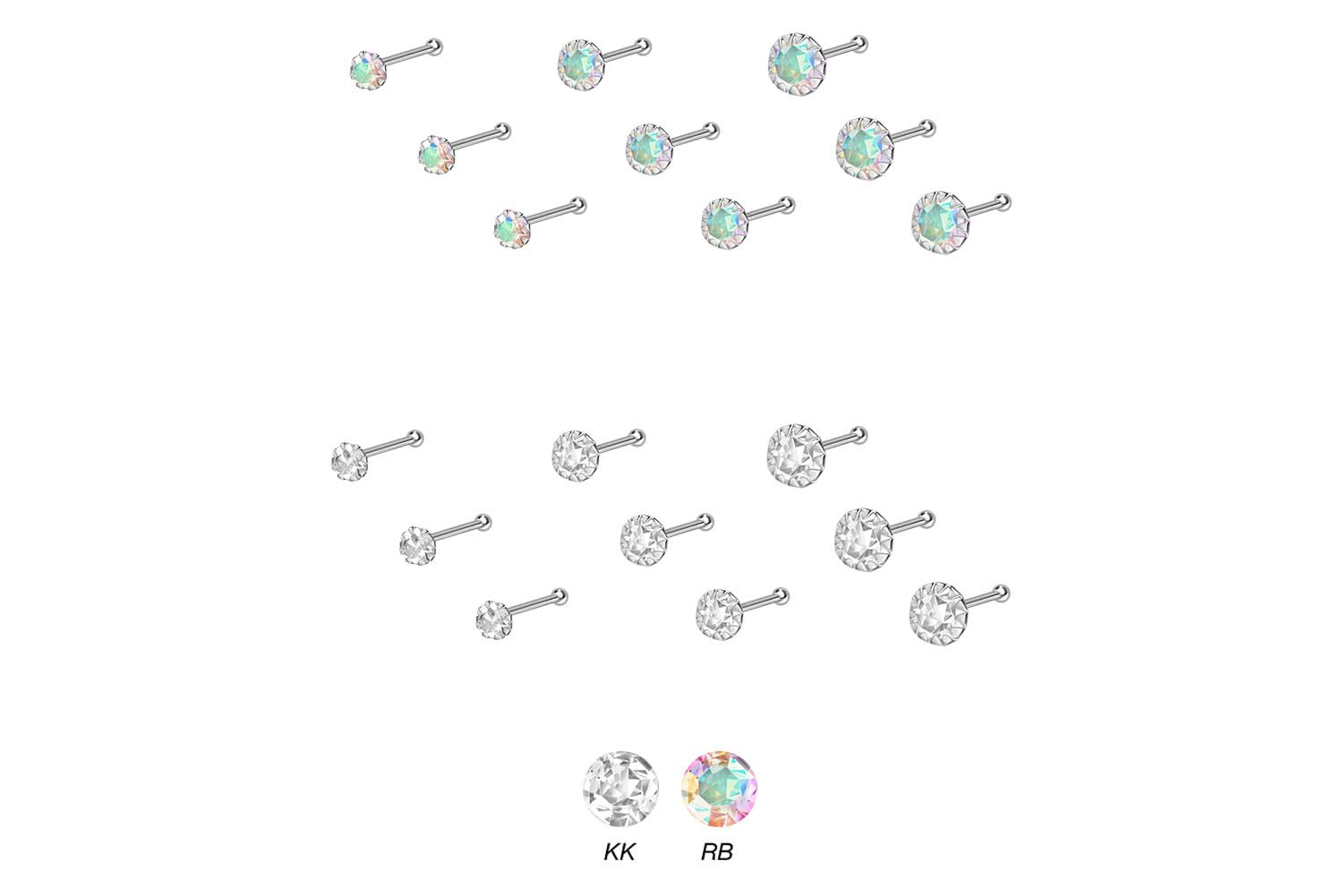 unten aufgelistet sind. Da es sich bei diesen Schmuckstücken um Pins handelt, dient je eine kleine Kugel als Gegenstück zu den besagten Kristallen, um einen sicheren Halt in der Nase zu gewährleisten. Darüber hinaus verfügen die Nasenstecker über eine Stabstärke von 0,6 mm,