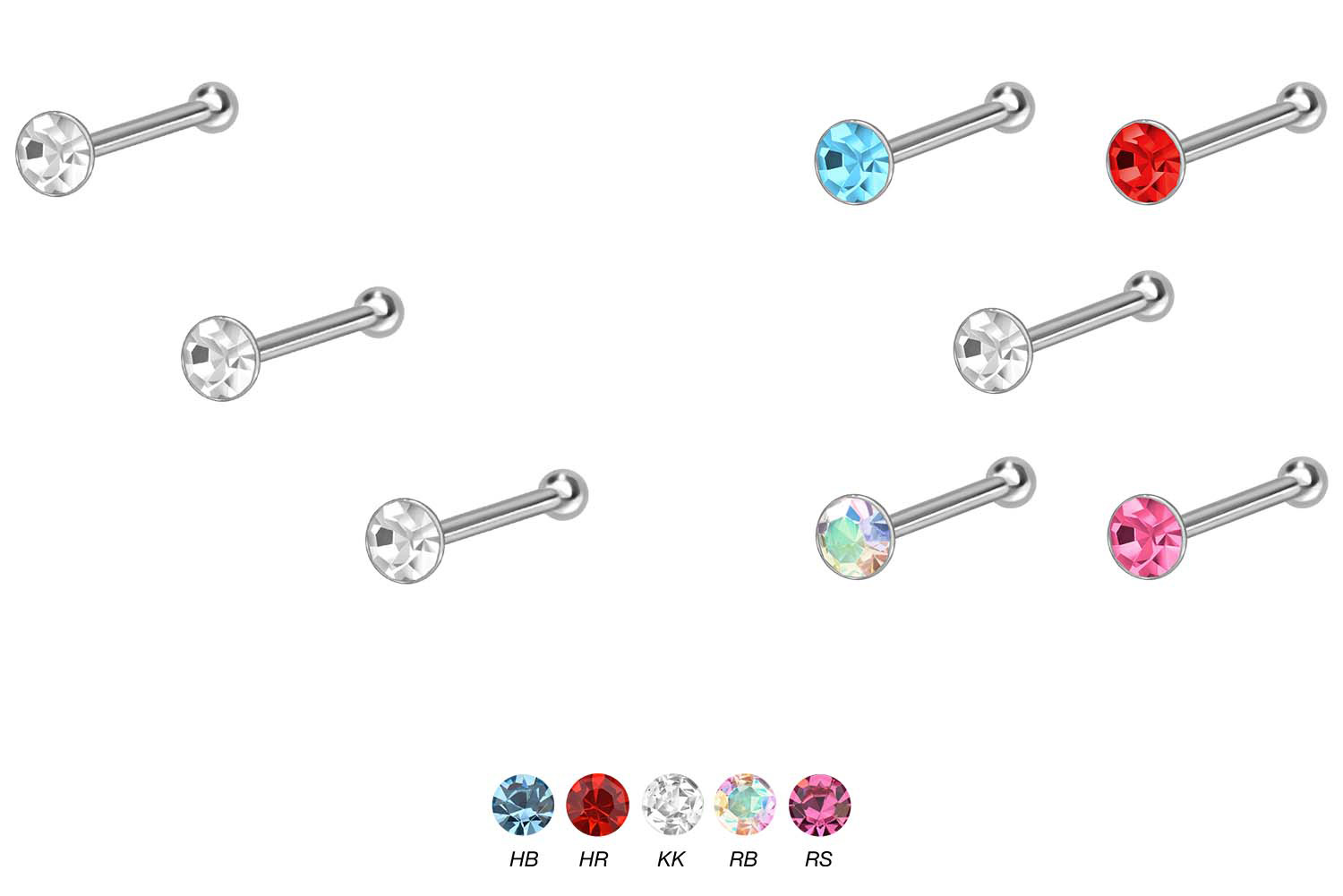 angenehmen Tragekomfort. Als besonderes Highlight ziert jeden Nasenstecker jeweils ein runder Kristall, dessen auswählbare Farben unten aufgelistet