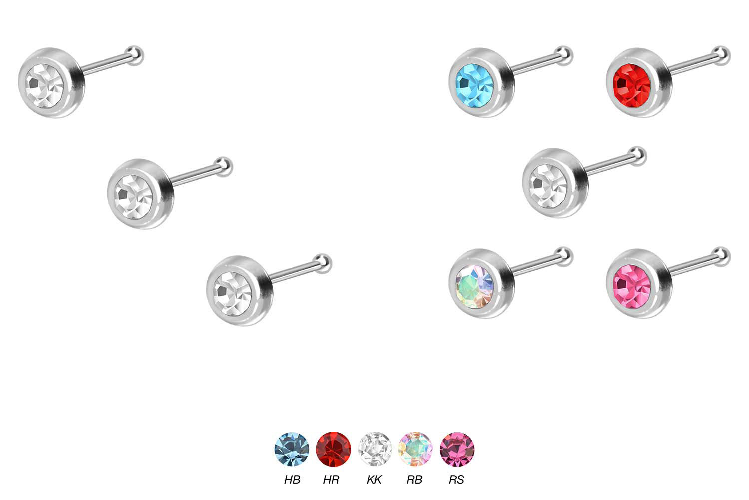 angenehmen Tragekomfort. Als besonderes Highlight ziert jeden Nasenstecker jeweils ein runder Kristall, dessen auswählbare Farben unten aufgelistet