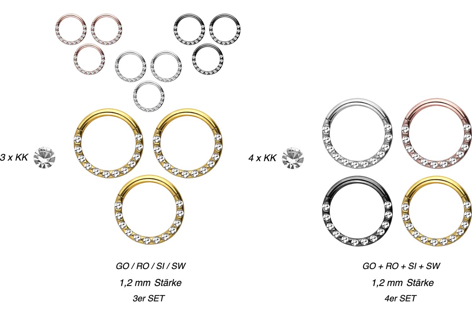 Zusammensetzung (4er Set): jede Materialfarbe (SI/RO/SW/GO) 1x in Verbindung mit einem Innendurchmesser