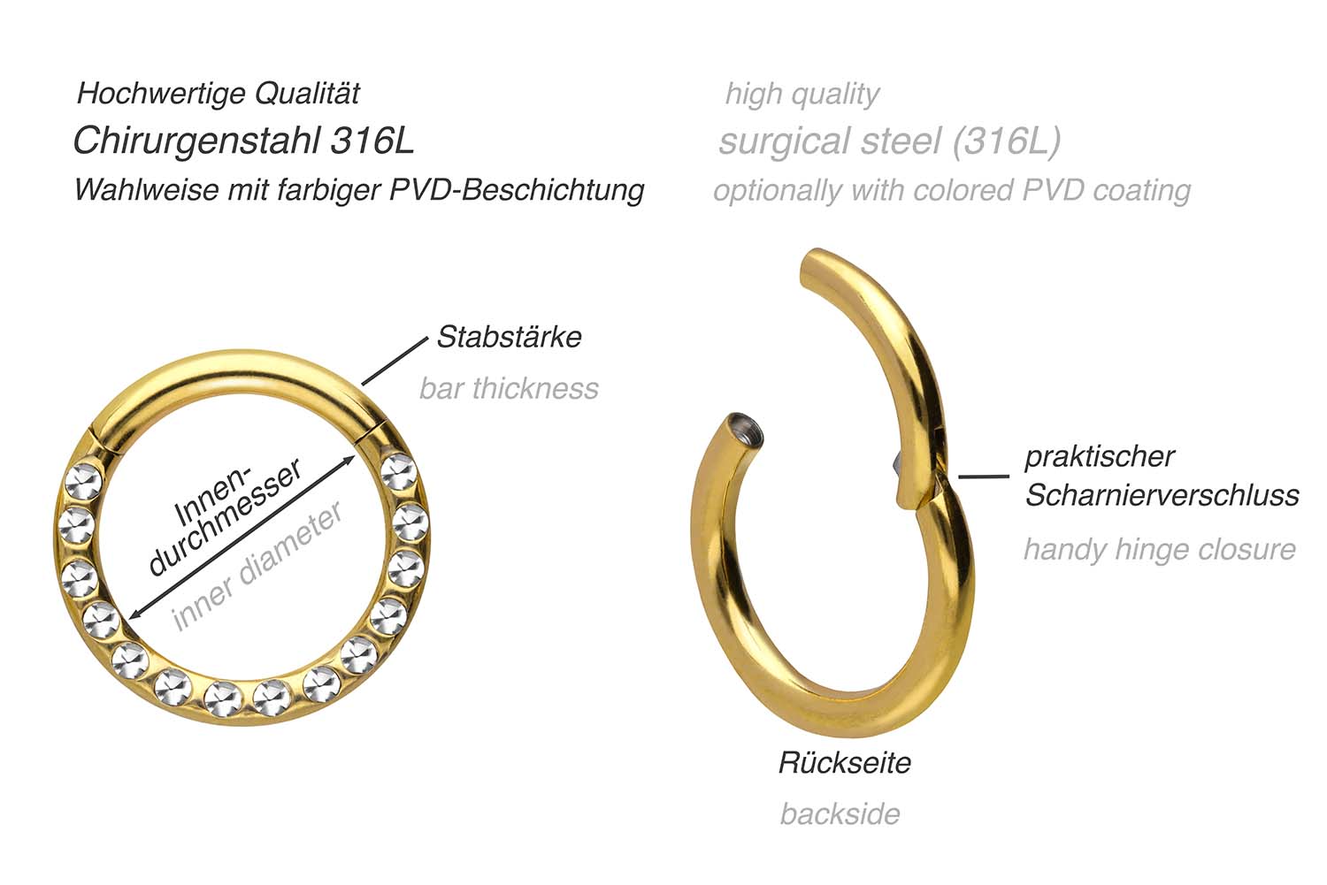 Einfache Handhabung und schönes Design – das sind unsere Clicker! Als Hauptmerkmal der Clicker zählt das praktische Scharnier, das den Einsatz in den Stichkanal enorm erleichtert. Das zur Herstellung verwendete Material (Chirurgenstahl 316L) zeichnet sich insbesondere durch ebene Beschaffenheit und hochwertige Qualität aus. Je nach Farbwunsch ist das Piercing mit einer kratzfesten PVD-Beschichtung überzogen. Eine klare