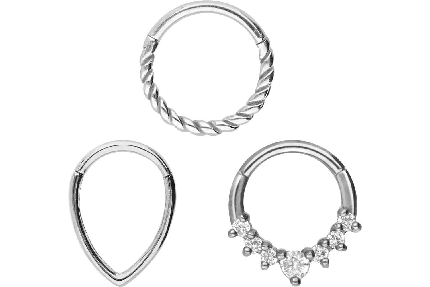 das Piercing mit einer kratzfesten PVD-Beschichtung überzogen. Dieses Set besteht aus Artikeln mit drei verschiedenen Designs, sodass sich für jeden Anlass der passende Clicker finden lässt. Ob am Ohr, der Nase, oder der Lippe – unsere Clicker sind für die verschiedensten Piercingstellen geeignet.