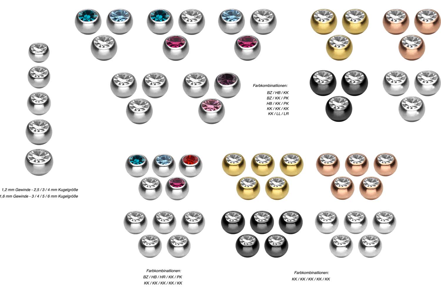 Diese klassischen Schraubkugeln sind aus hochwertigem Titan gefertigt, das je nach Farbwunsch mit einer kratzfesten PVD-Beschichtung versehen ist. Besonders hervorzuheben ist die weißgoldfarbene PVD-Beschichtung, die den bezaubernden Schmuckstücken einen hellen silbrigen Glanz verleiht. Zu den Materialeigenschaften von Titan gehören neben der hohen Qualität auch gute Hautverträglichkeit und Beständigkeit. Das Set besteht entweder aus 3 oder 5 Schraubkugeln. Sie haben ein Gewinde von 1,2 mm oder 1,6 mm und sind in den unten aufgeführten Größen erhältlich. Die schimmernden Kristalle lassen sie zudem in vollem Glanz erstrahlen. Es gibt viele Kombinationsmöglichkeiten mit unseren anderen Produkten.