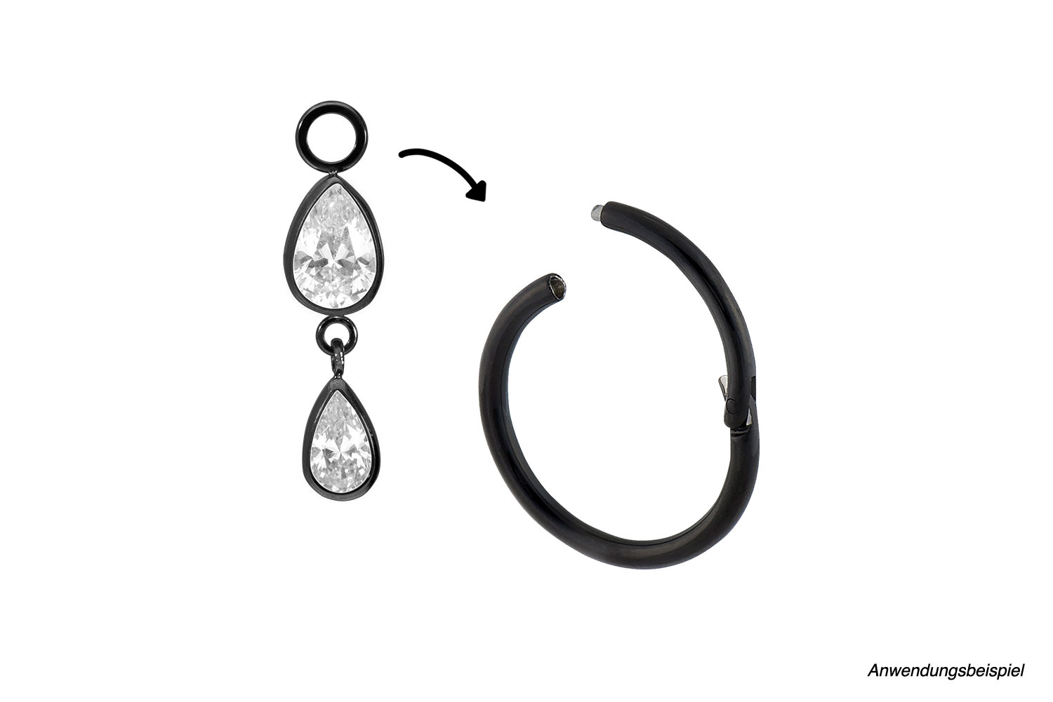 geöffnet und das Schmuckstück angebracht werden. Es besteht aus hochwertigem Titan (Grad 23) zu dessen Materialeigenschaften unter anderem gute Hautverträglichkeit und hohe Beständigkeit zählen. Hinzu kommt