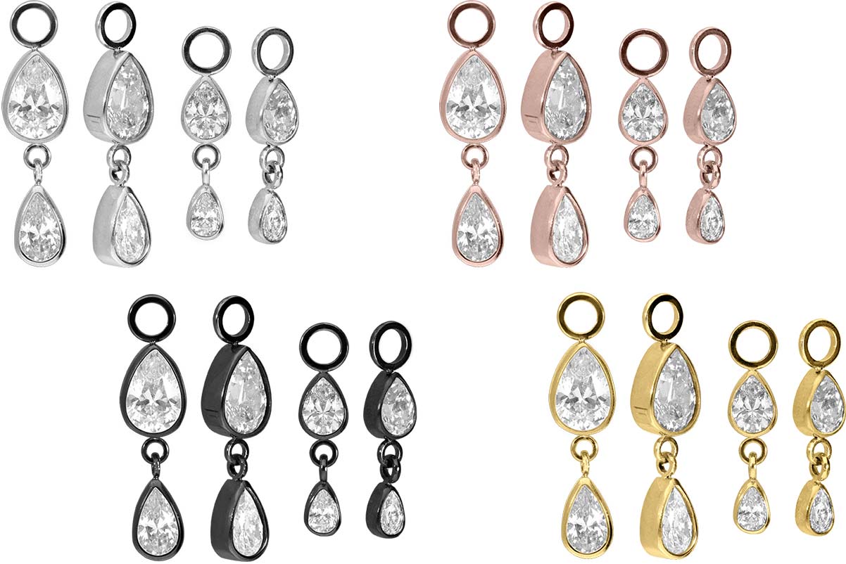 Varianten mit farbiger PVD-Beschichtung gewährleistet wird. So wird dieser entzückende Anhänger in Form von zwei Kristalltropfen zu einer hervorragenden Ergänzung für jeden entsprechenden